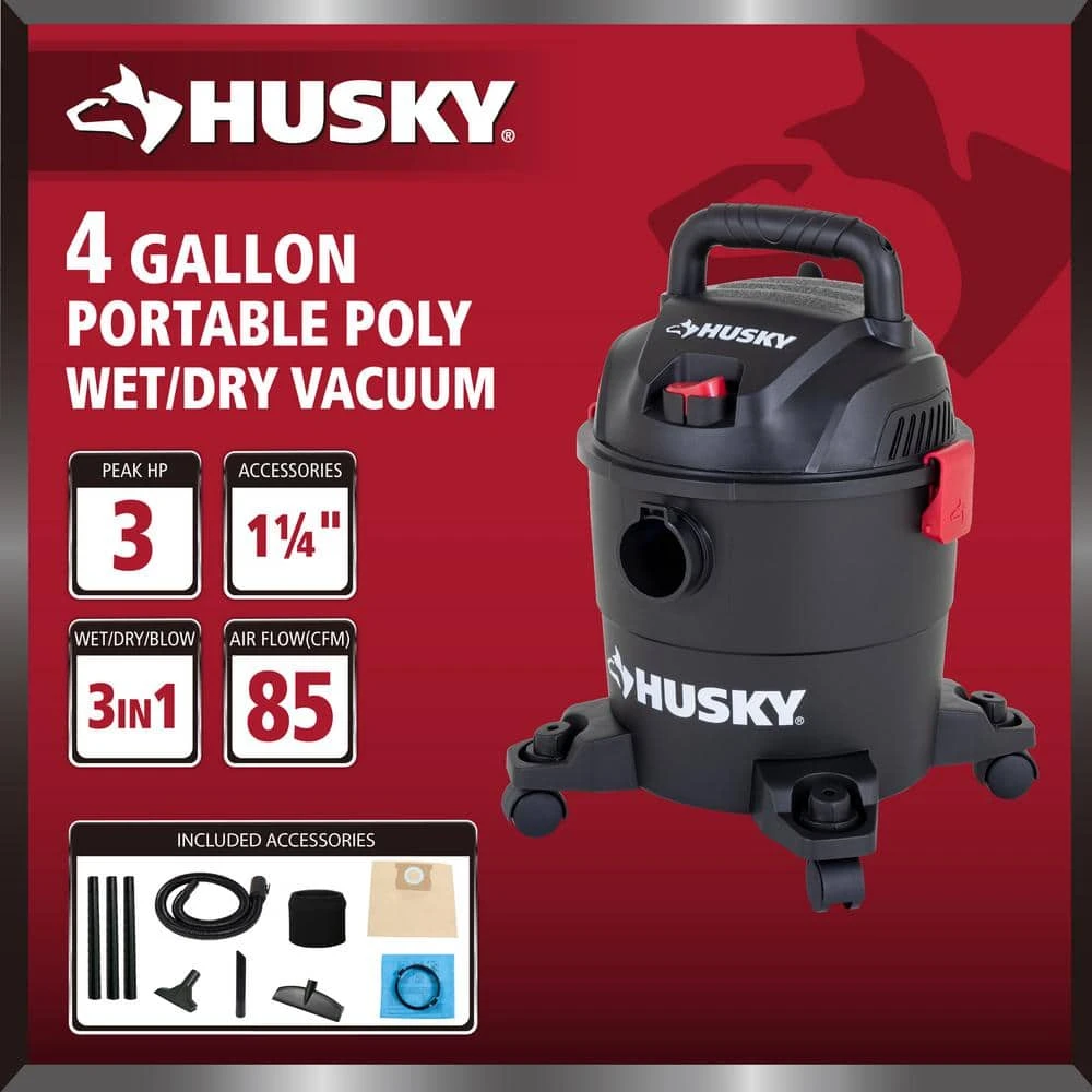 The Husky 4 Gal.* Polly Wet/Dry Vac features a strong handle for easy portability. Its large on/off switch and swiveling casters provide ease of use no matter the chore. Whether you need to tackle a wet or dry mess, let this vac help you make short work of any job. *Tank capacity refers to actual tank volume and does not reflect capacity available during operation.**Peak Horsepower