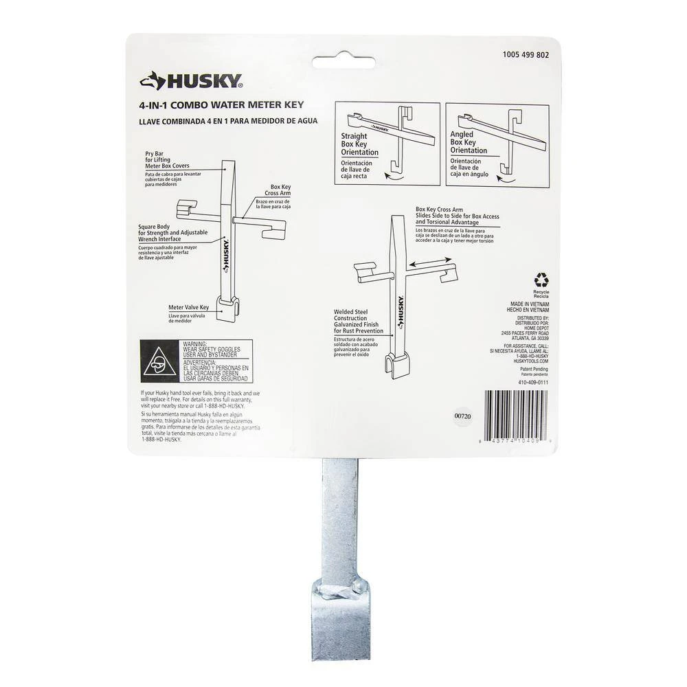 The 4-in-1 Combination Meter Valve Tool features four tools in one. The pry bar helps to loosen stuck valves or open water main covers. The built-in wrench can be used to shut off or turn on water main. The angled and straight keys are designed to open meter/valve box lid. Backed by the Husky Lifetime Warranty.