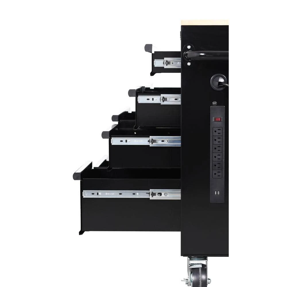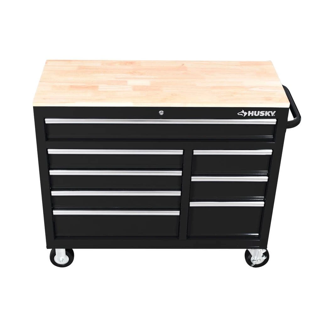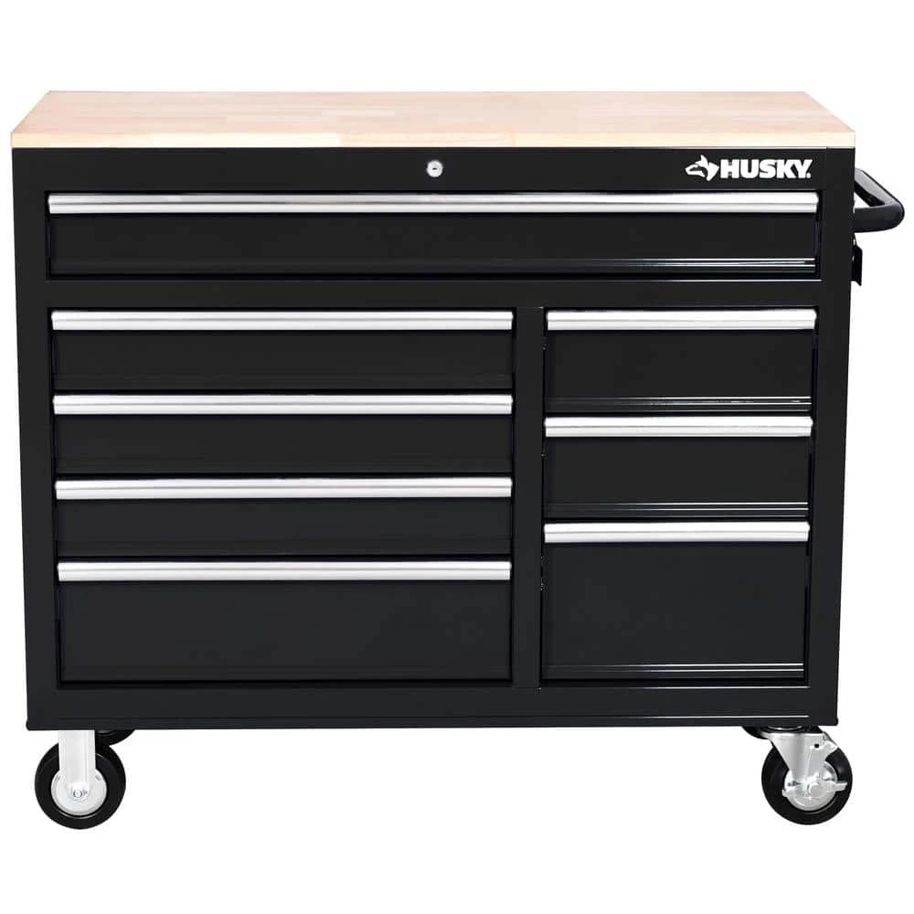 The Husky 42 in. W x 18.1 in. D 8-Drawer Black Mobile Workbench with Solid Wood Top is here. This workbench is constructed of 21-Gauge steel and has a large wood surface for all your projects. The 8-drawers combine for 12,201 cu. in. of storage space. All drawers glide effortlessly on 100 lbs. rated ball-bearing slides. These slides are also equipped with a soft-closing mechanism that prevents your drawers from slamming shut. Each drawer also has a pre-cut liner inside to help keep your tools in place. On the side of the workbench is an integrated power strip that has 6 outlets and 2 USB ports. Storage hooks are available when cord is not in use. Finally, there are 5 in. x 2 in. casters and a push handle that will allow you to move the workbench around your work space with ease.