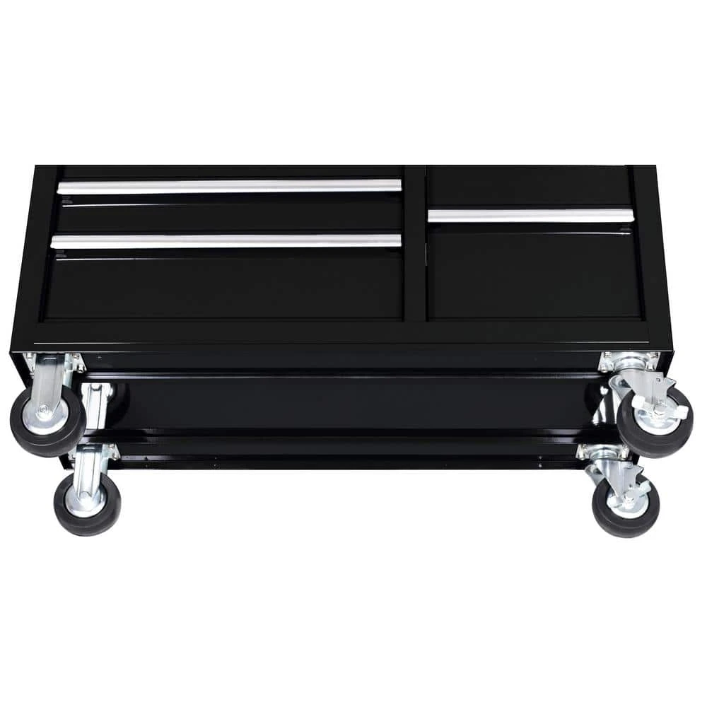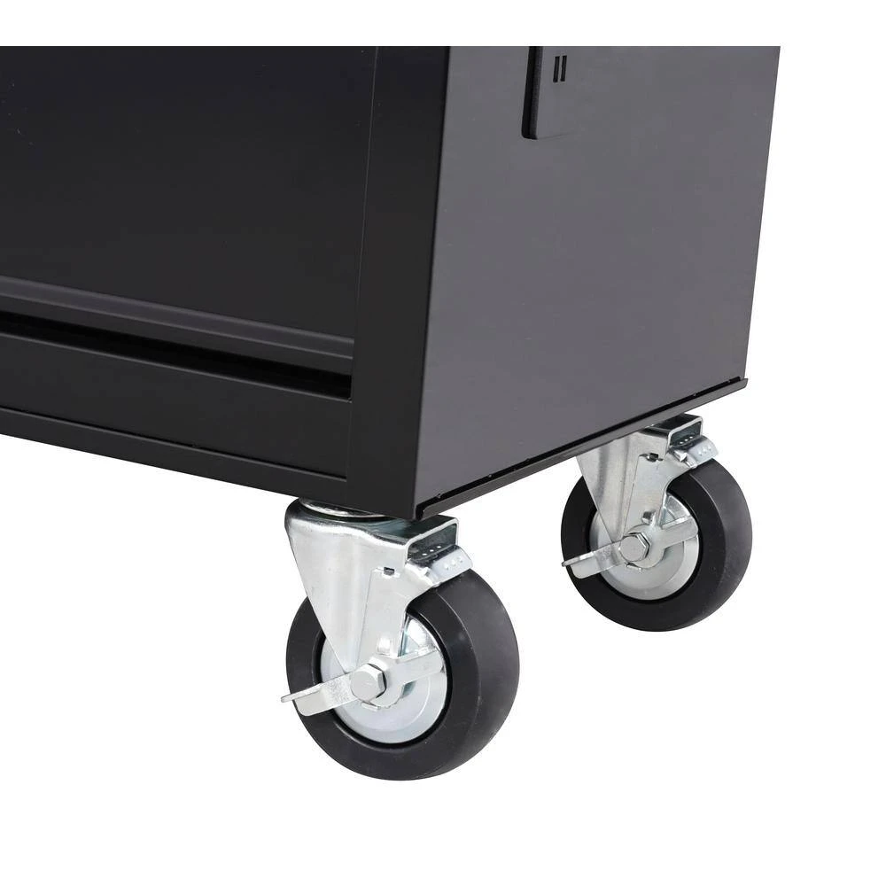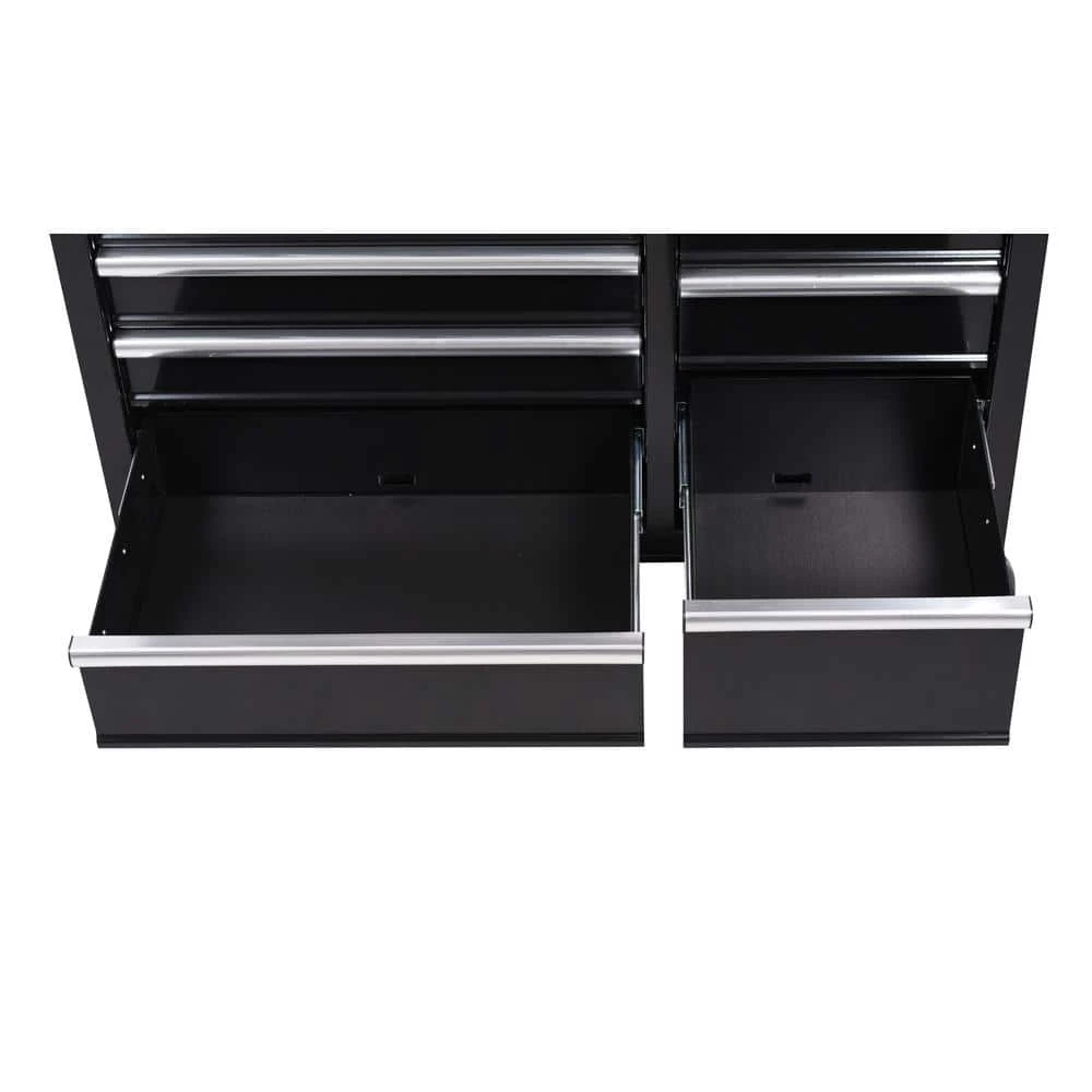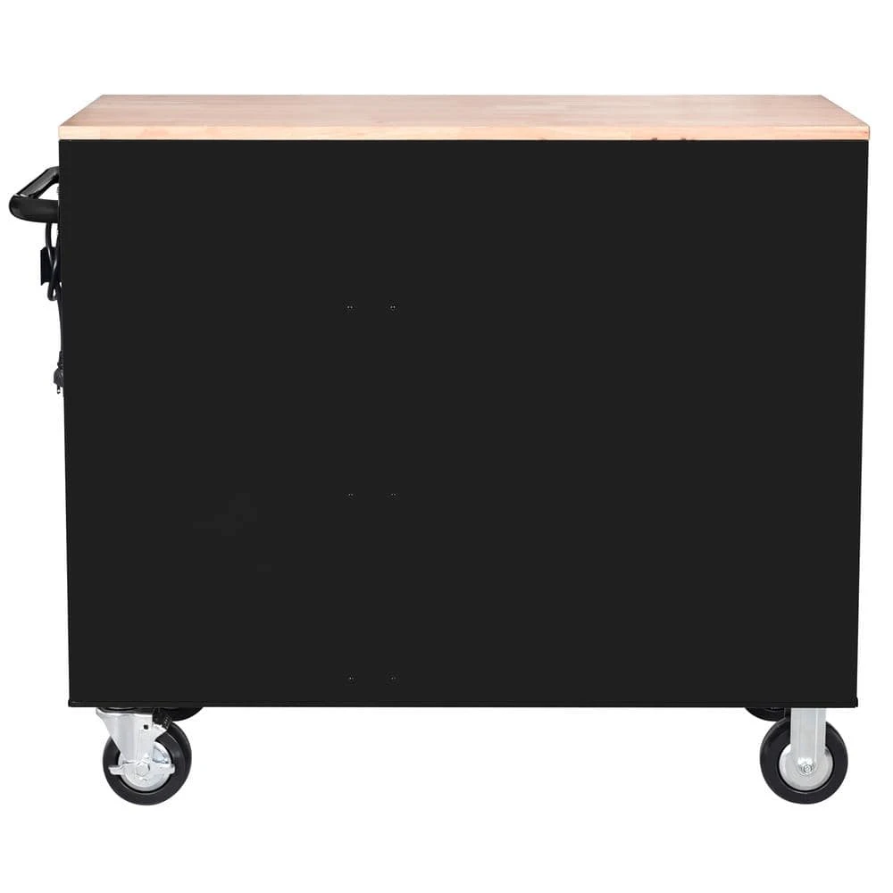 The Husky 42 in. W x 18.1 in. D 8-Drawer Black Mobile Workbench with Solid Wood Top is here. This workbench is constructed of 21-Gauge steel and has a large wood surface for all your projects. The 8-drawers combine for 12,201 cu. in. of storage space. All drawers glide effortlessly on 100 lbs. rated ball-bearing slides. These slides are also equipped with a soft-closing mechanism that prevents your drawers from slamming shut. Each drawer also has a pre-cut liner inside to help keep your tools in place. On the side of the workbench is an integrated power strip that has 6 outlets and 2 USB ports. Storage hooks are available when cord is not in use. Finally, there are 5 in. x 2 in. casters and a push handle that will allow you to move the workbench around your work space with ease.