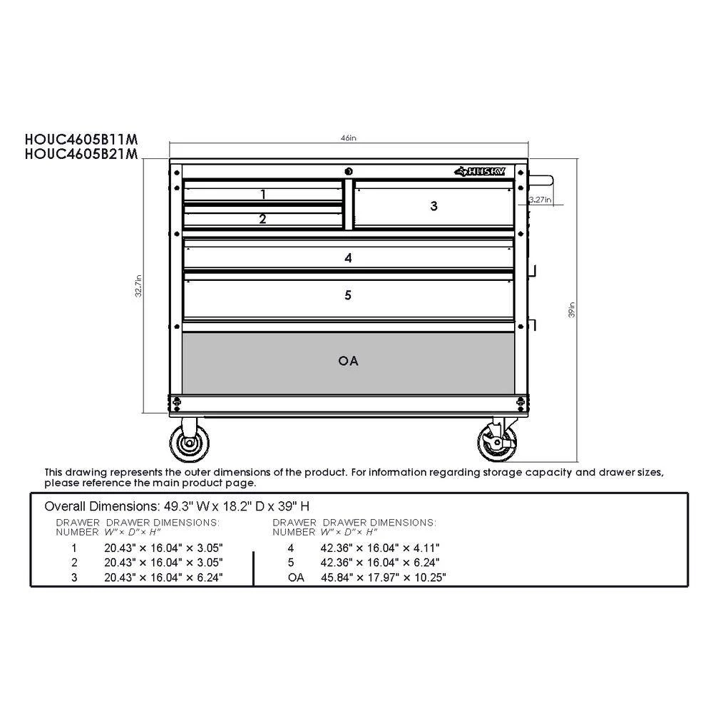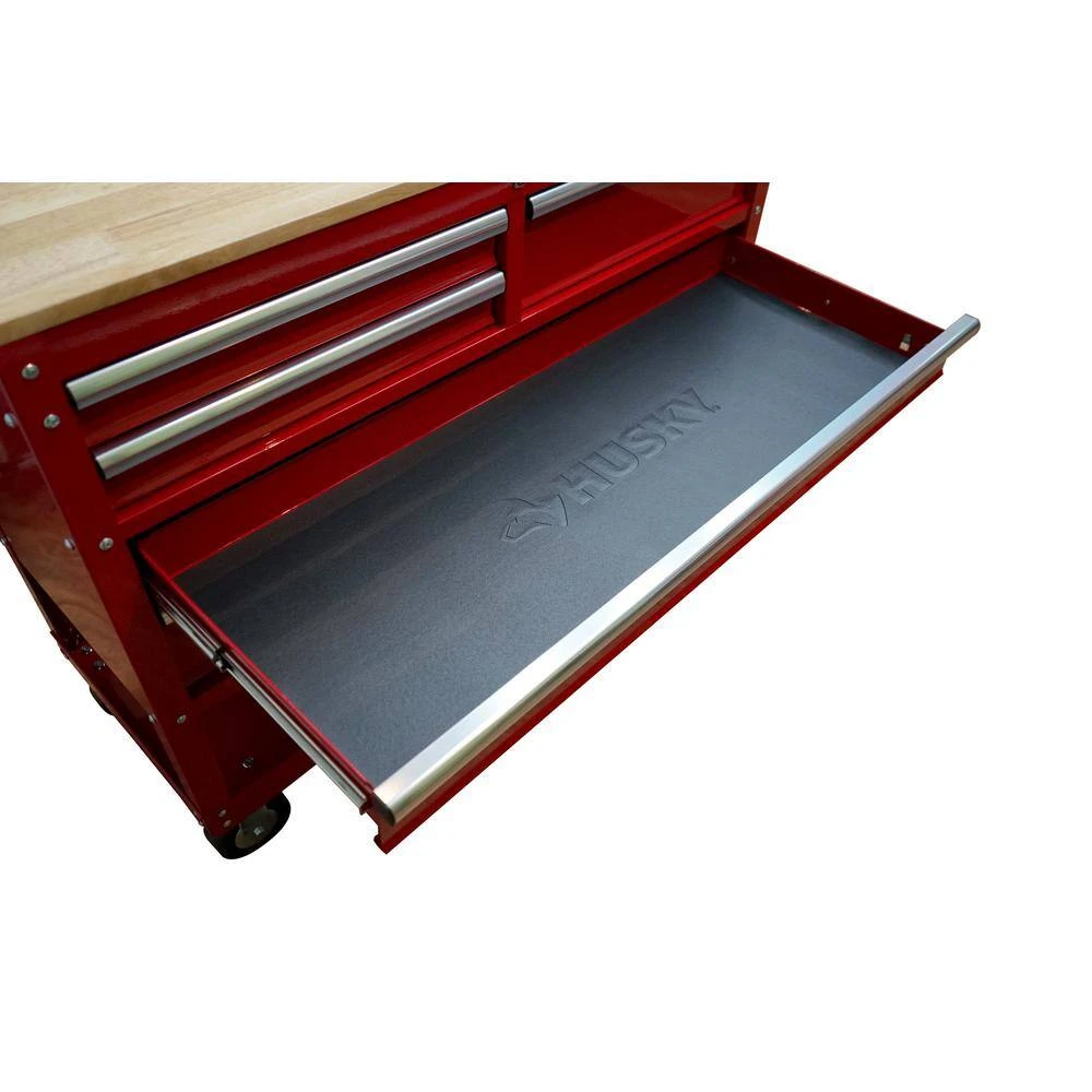 The Husky 46 in. 5-Drawer Tool Cart is a heavy-duty utility cart that is essential in the shop, garage or even the office. The multi-sized drawers are equipped with 100 lbs. rated ball bearing slides to hold a variety of tools. The bottom storage tray is reinforced steel for your larger, heavier items and has approximately 10.25 in. of storage space height. The larger, push-bar handle and heavy-duty, 5 in. x 2 in. casters allow this cart to be easily moved around your work area. It is constructed with heavy 21-Gauge steel and is strong enough to support 700 lbs. The 0.75 in. thick solid wood top is sealed with a protective coating to protect it from the elements. The bottom 2 drawers are deep to hold larger tools. This cart also includes a built-in power center with 6 outlets and 2 USB ports as well as premium drawer liners. With no clumsy washers and nuts to deal with, this tool cart can be assembled in minutes with the included bolts and pre-mounted threads.