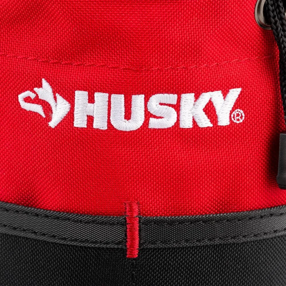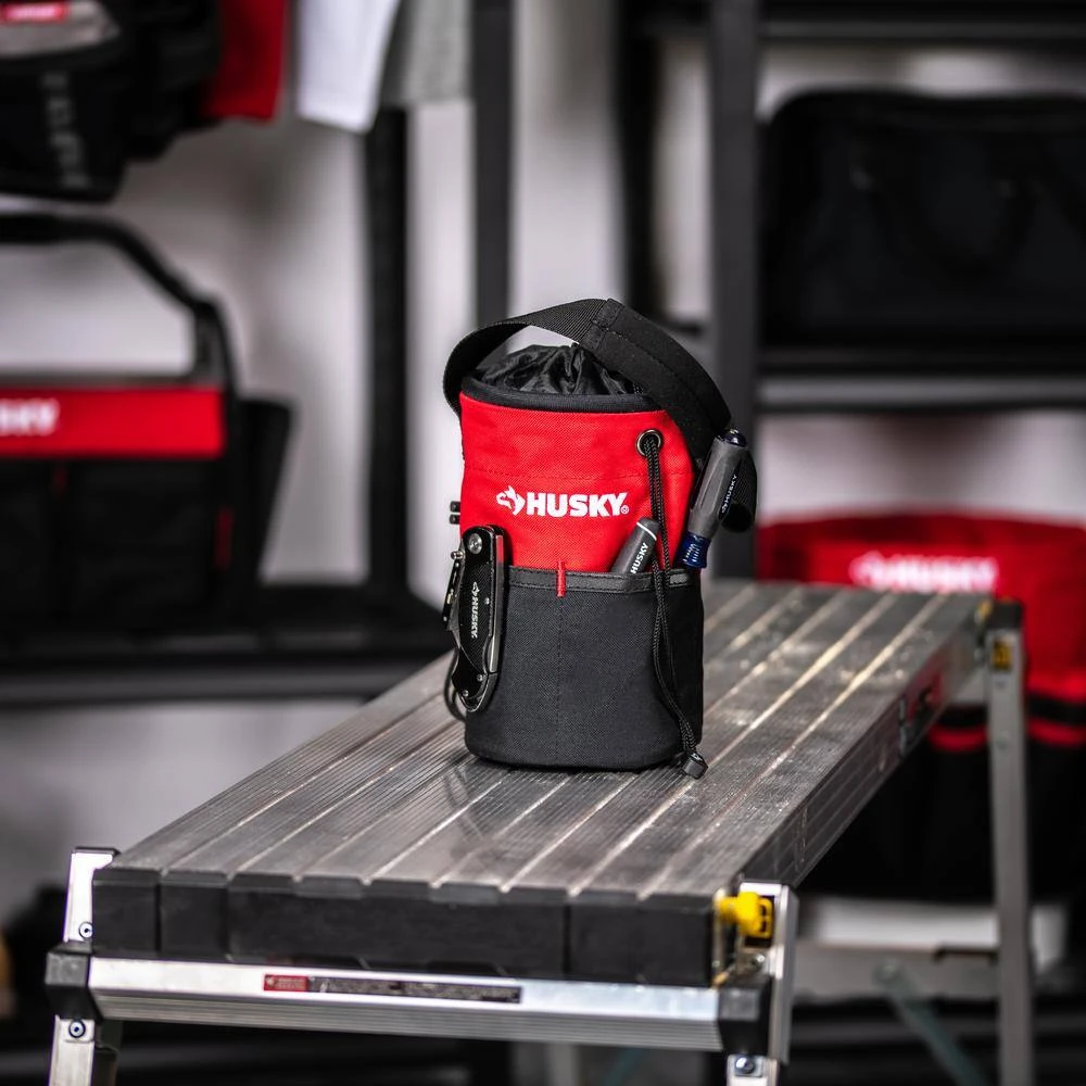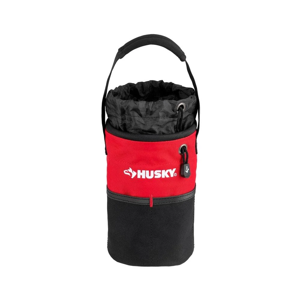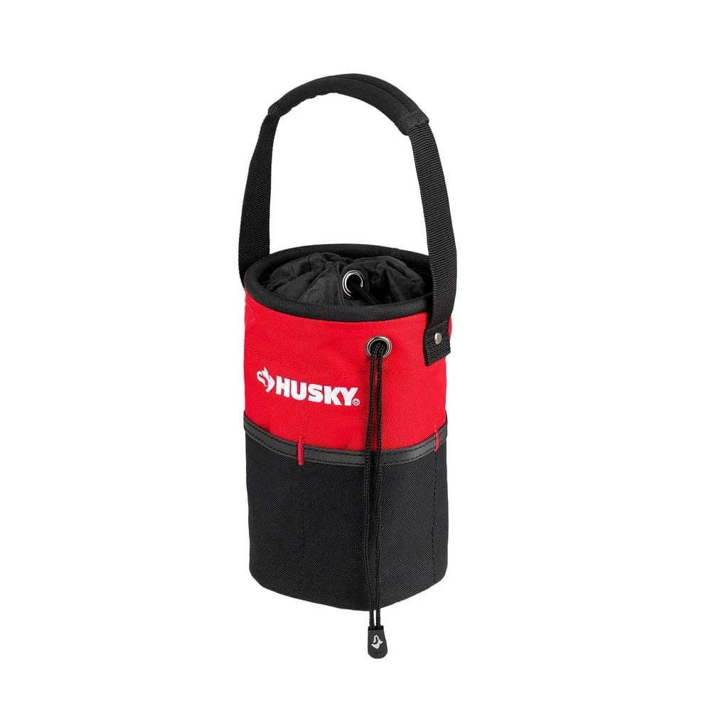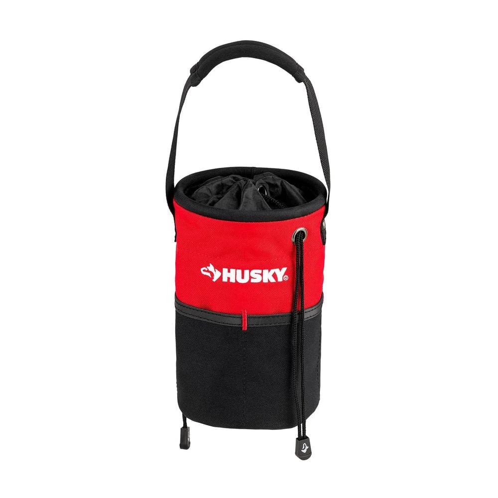 The Husky 5 in. Utility Sack tool bag allows for closed storage of smaller items by pulling the drawstring or can be used as an open-top bag to accommodate for larger items. This tool storage utility sack keeps your contents easily accessible with multiple exterior and interior pockets. It also features a large main compartment for storing multiple tools and accessories as well as a carrying strap for easy transport. This Husky tool pouch is constructed of 600 Denier water resistant material and carries a 3-yr warranty.