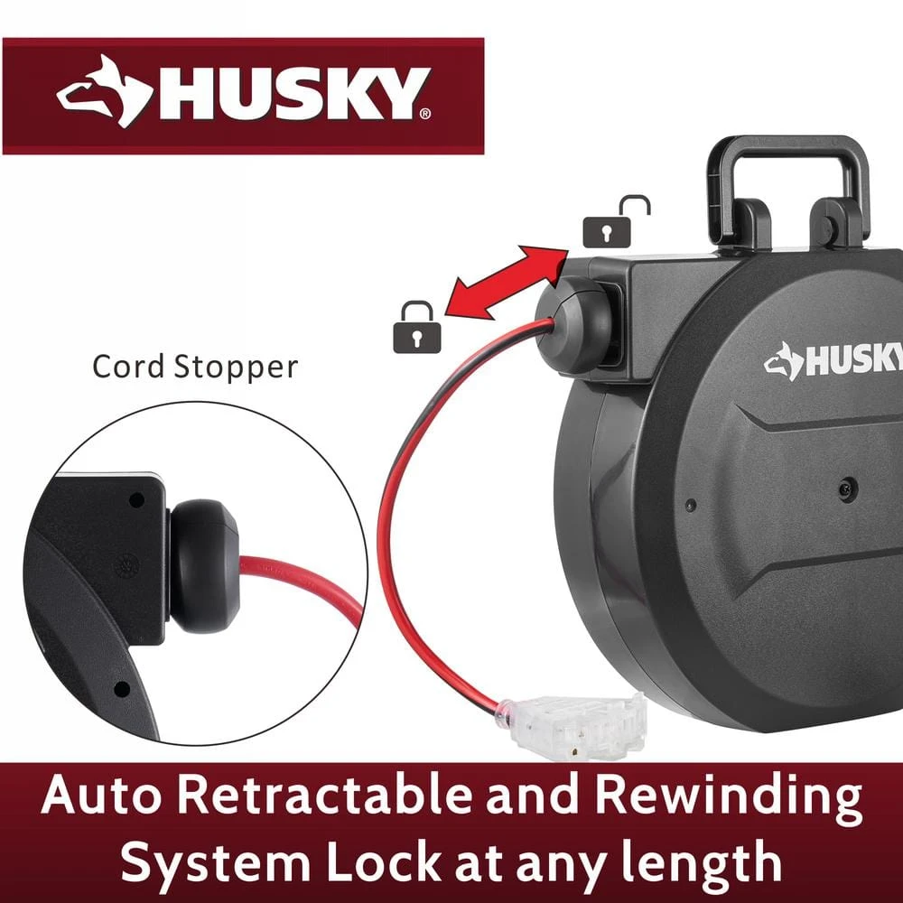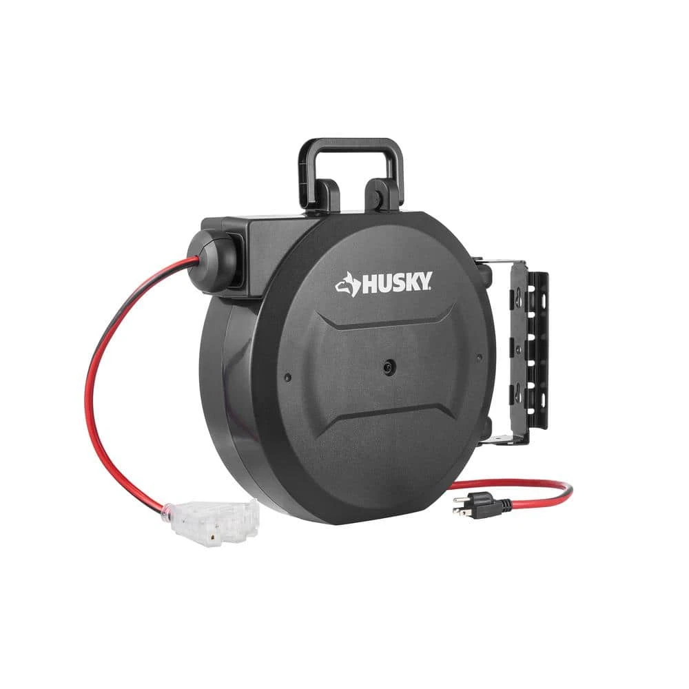 This Husky 50 ft. 14/3 Medium Duty Indoor Extension Cord Reel is a power station with a 3 outlet, triple tap end. With a clever auto-guide rewind mechanism to avoid kinks and tangles, the power cord reel will retract the 50 ft. extension cord quickly and smoothly; the ratcheting system can also lock the cord at any length you need. Featuring a mounting bracket that can easily be affixed to a wall or a bench.