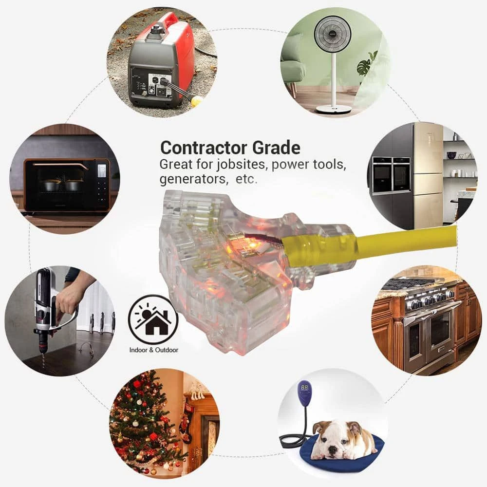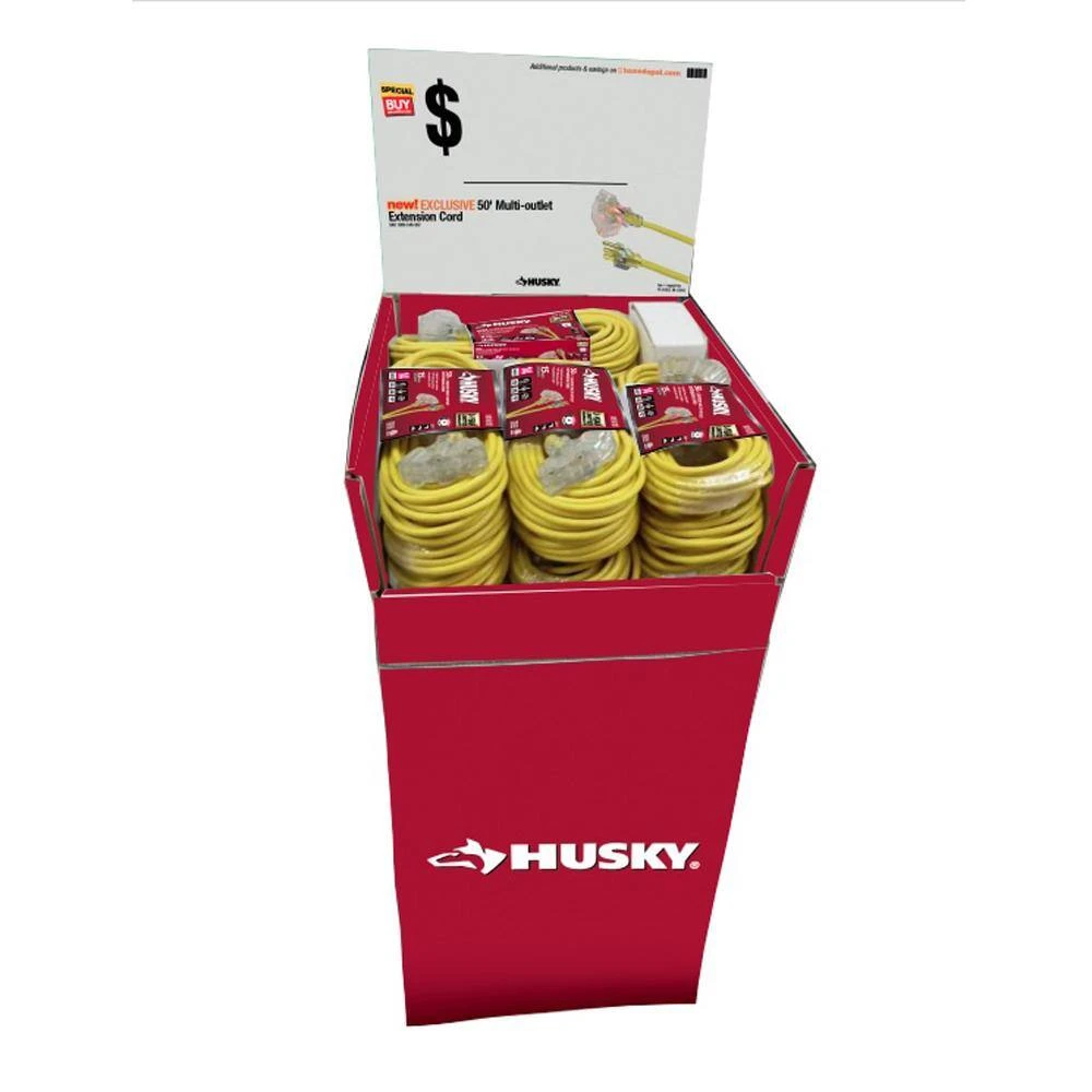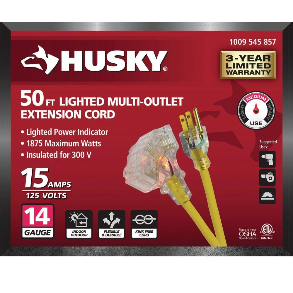 The Husky 50 ft. 14/3 Medium-Duty Indoor/Outdoor Extension Cord is designed to expand flexibility on the job site by helping to facilitate electrical tool mobility. This cord features a light that indicates power usage. vinyl and kink-free cord