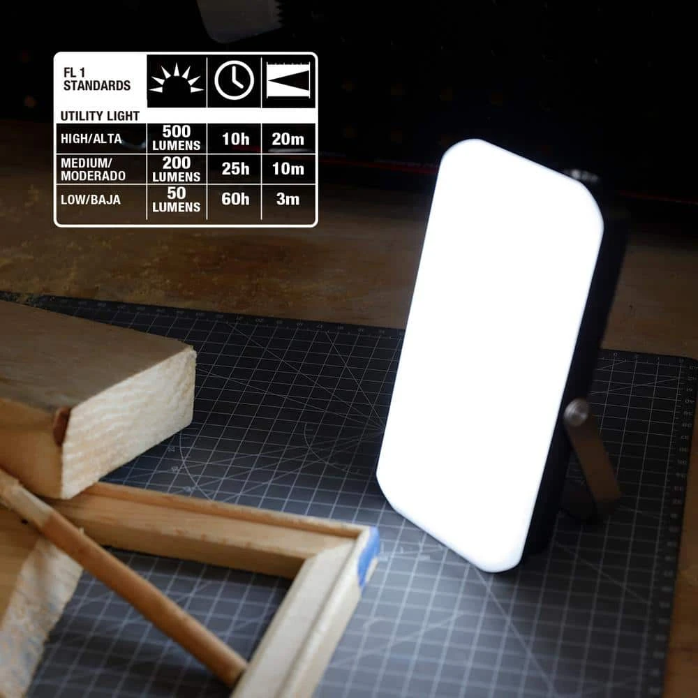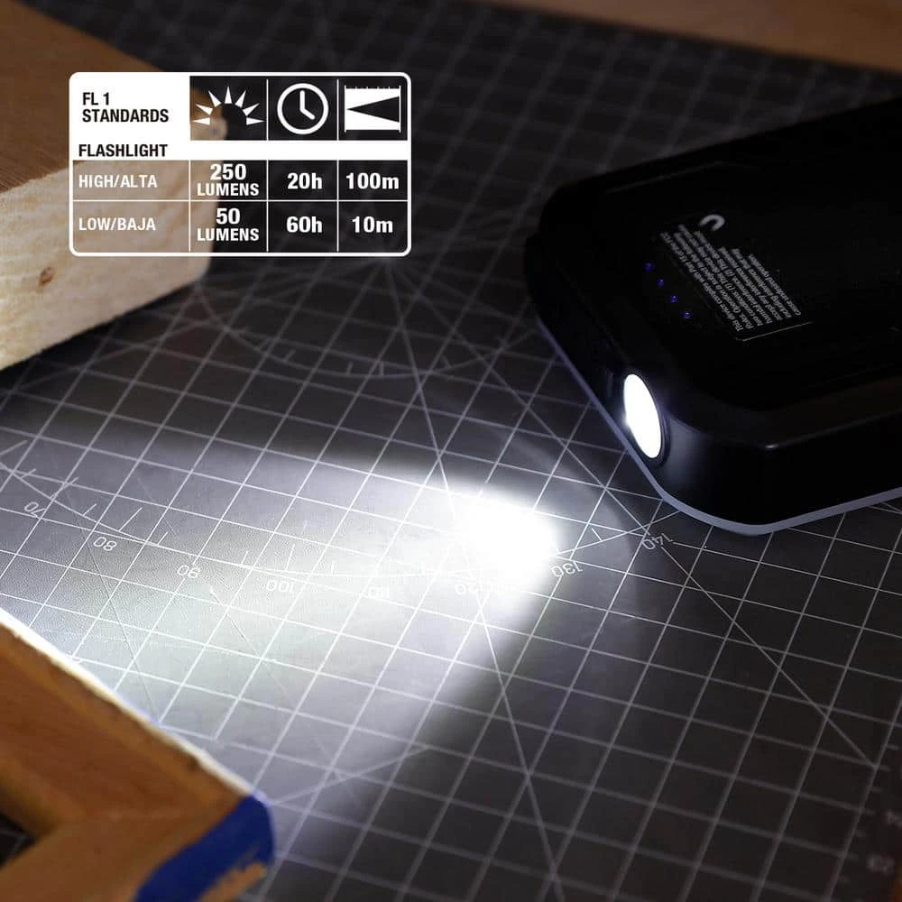 The Husky 500-Lumens Rechargeable Light has 3-in-1 function, and can be used as flashlight, utility light and power bank. It has a super large capacity of 10k mAh, which provides a long battery life and an emergency power supply. Features include a 90° degree pivoting handle on the back for easy standing and a magnet for hands free operation. The multi-function light is great for different applications indoors or outdoors. This light has 5 beam modes: Flashlight at High and Low mode; Utility light at High, Medium and Low modes. The flashlight high mode is 250-Lumens / 35 hours run time / 80 m throw. Low mode is 50-Lumens / 80 hours run time / 10 m throw. Utility light high mode: 500-Lumens / 15 hours run time / 20 m throw; Medium mode: 200-Lumens / 45 hours run time / 10 m throw; Low mode: 50-Lumens / 80 hours run time / 3m throw. Universal: compatible with all USB devices and can charge 3-devices simultaneously