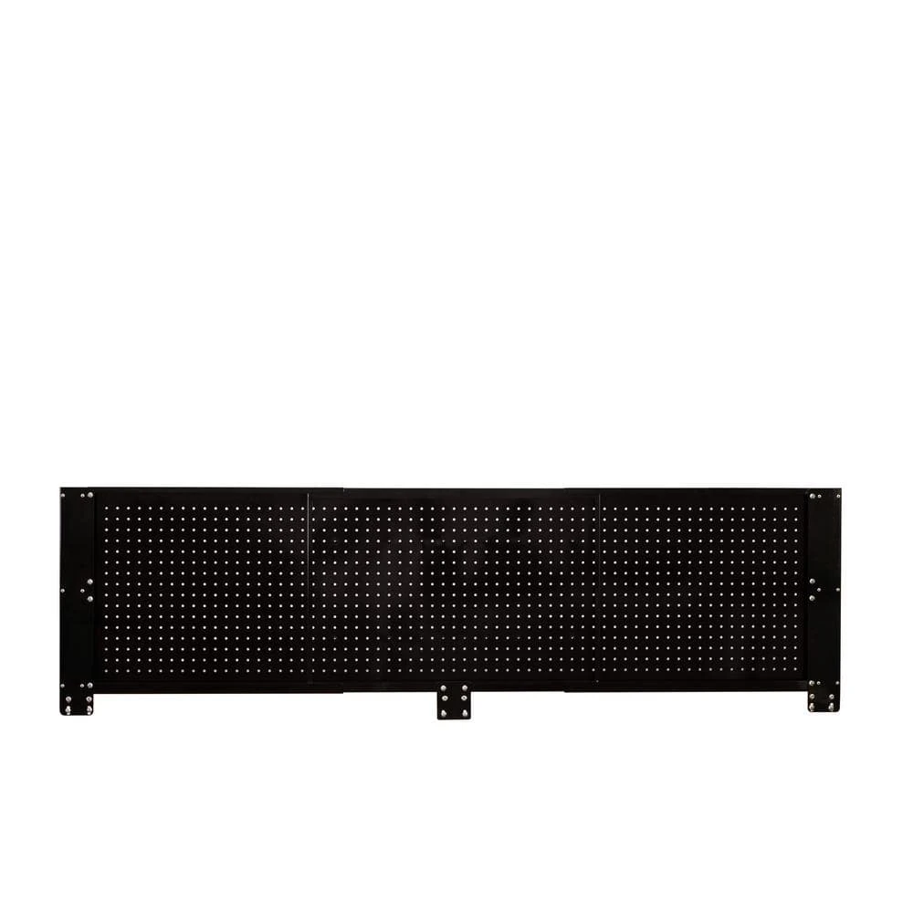 The Husky Gloss black Pegboard Back Wall adjust from 52 in. W to 72 in. W making this the perfect accessory to select Husky Mobile workbenches. It adds vertical storage to hang a variety of items, including your heavier power tools. The heavy-duty, 21-Gauge steel will support up to 150 lbs. and is much stronger than conventional pegboard. The peg holes will accommodate most 1/4 in. and 1/8 in. peg hooks, which are positioned 1 in. on center.