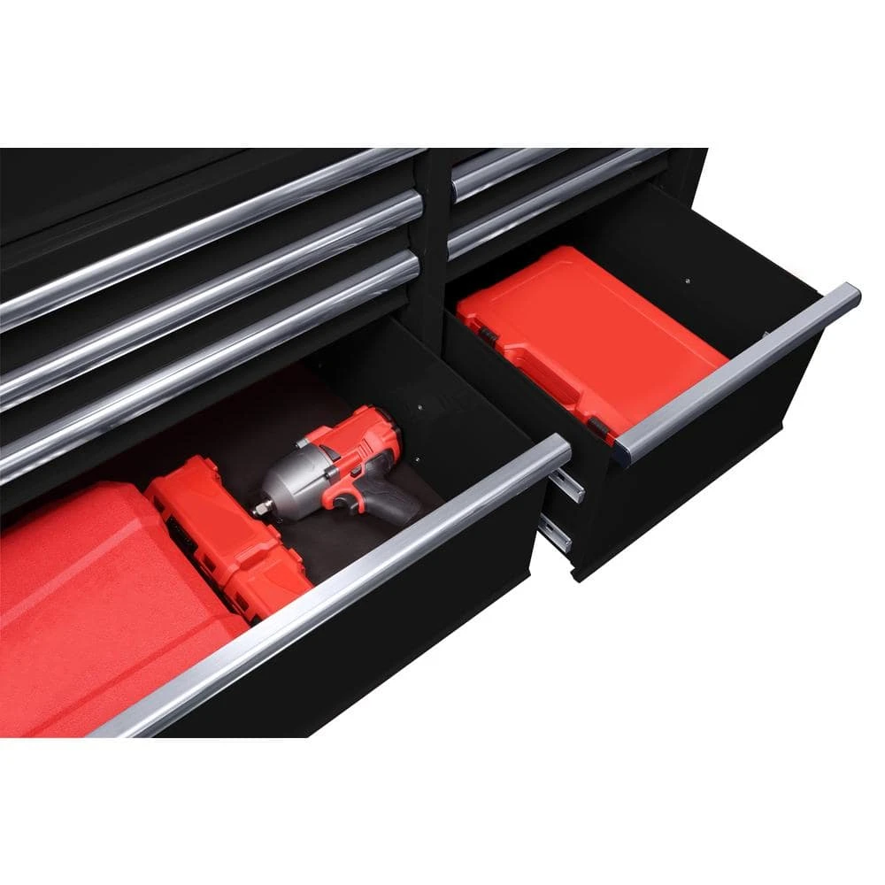 Built for its functional work space and large storage capacity the Husky 52 in. 9-Drawer 24.5 in. D mobile workbench with stainless steel pegboard is the perfect combination for your tool storage system. The workbench and pegboard back wall were both constructed with heavy 21-Gauge steel and have 1200 lbs. and 150 lbs. weight capacities (respectively). This mobile work center has large, 5 in. x 2 in. casters and a steel tubular side handle, which allow you to easily move it, even when fully loaded. Each drawer is equipped with 100 lbs. rated ball bearing slides. The top long drawer and 2 deep bottom drawers have double sets of 100 lbs. rated soft closing slides to enable you to store your heavier bulk items. It is constructed with heavy 21-Gauge steel and is strong enough to support 1,200 lbs. and has 20,527 cu. in. storage capacity. The 1 in. thick solid wood top is sealed with a protective coating to protect it from the elements. The pegboard has peg holes spaced 1 in. on center and accommodates most standard size 1/4 in. and 1/8 in. peg hooks. Stainless Steel Pegboard Included with 150 lbs. weight capacity.