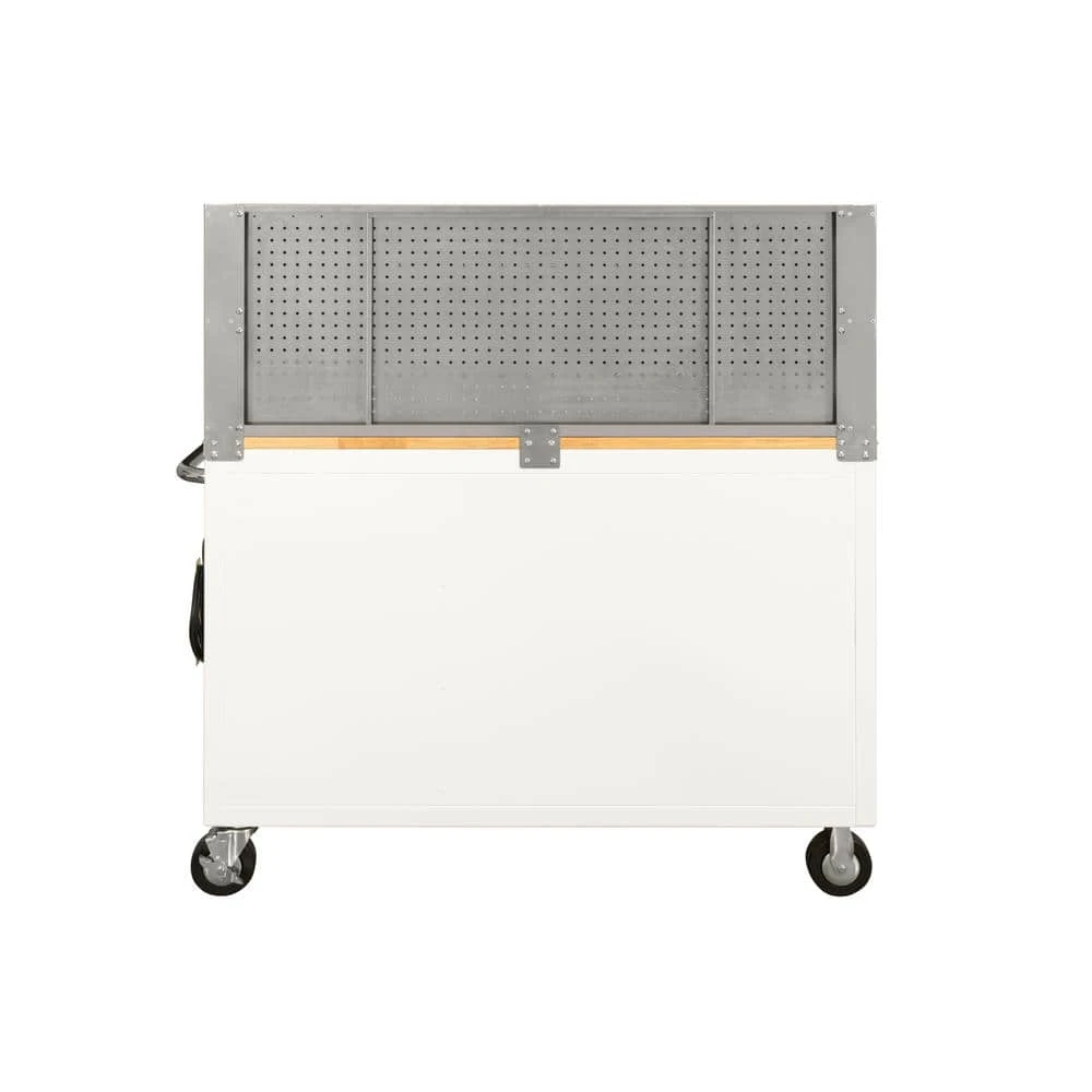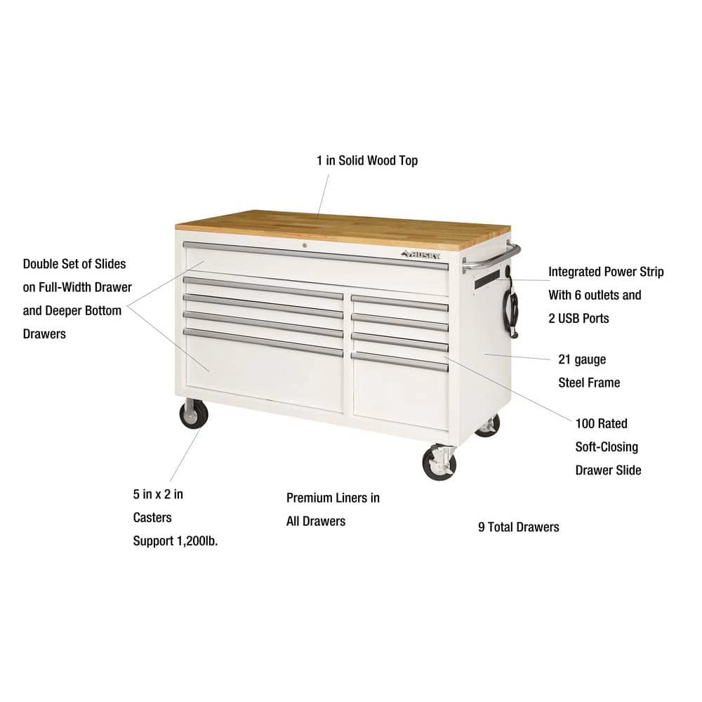 Built for its functional workspace and large storage capacity the Husky 52 in. 9-Drawer 24.5 in. D mobile workbench with Stainless Steel Pegboard is the perfect combination for your tool storage system. This mobile work center has large, 5 in. x 2 in. casters and a steel tubular side handle, which allow you to easily move it, even when fully loaded. Each drawer is equipped with 100 lbs. rated soft closing ball bearing slides. The top long drawer and 2 deep bottom drawers have double sets of 100 lbs. rated slides to enable you to store your heavier bulk items. It is constructed with heavy 21-Gauge steel and is strong enough to support 1,500 lbs. and has 20,527 cu. in. storage capacity. The 1 in. thick solid wood top is sealed with a protective coating to protect it from the elements. The pegboard has peg holes spaced 1 in. on center and accommodates most standard size 1/4 in. and 1/8 in. peg hooks and has 150 lbs. weight capacity.