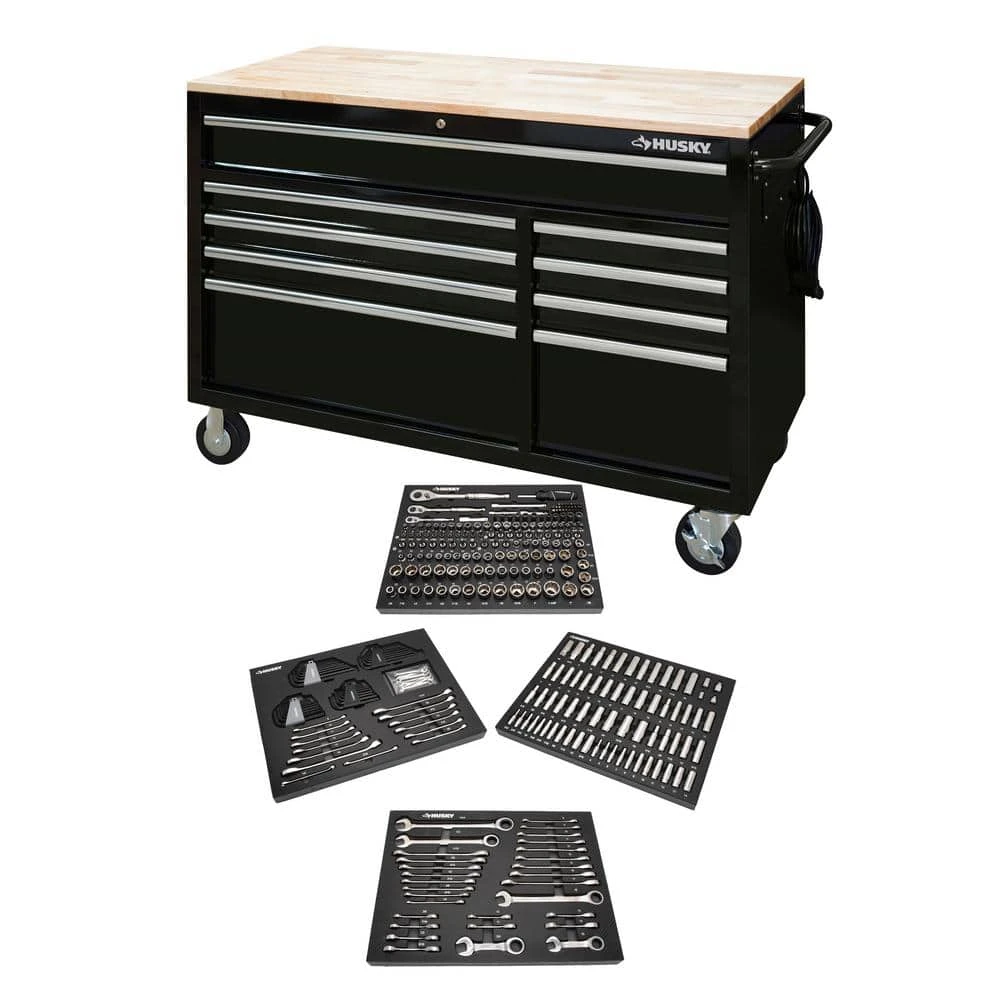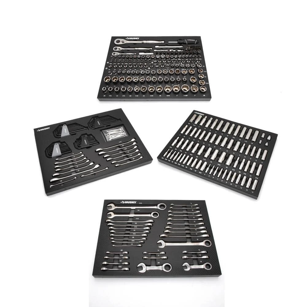 Pairing seamlessly with the 52 in. 9-Drawer Mobile Workbench, in Gloss Black, the 320-piece 1/4 in., 3/8 in. and 1/2 in. drive mechanics tool set is ideal for both professionals and DIY enthusiasts alike. This comprehensive set includes standard and deep sockets, combination wrenches, stubby wrenches and bit sockets to handle any fastening or repair project. The 12-point design of the Husky Ratcheting Wrenches prevents fastener damage and increases torque, while the polished chrome finish ensures corrosion resistance for a lifetime of use. The alloy steel construction guarantees long-lasting performance and the box-end design provides additional leverage to prevent slipping on hard-to-remove fasteners. With a ratcheting box-end requiring only a 5° arc to turn a fastener, even hard-to-reach areas become accessible. All 370 pieces are neatly organized in portable EVA foam storage trays, keeping your tools organized inside your toolbox. This Husky tool set is a reliable companion for both novice and professional users, offering a vast assortment of durable tools to tackle any job with ease.
