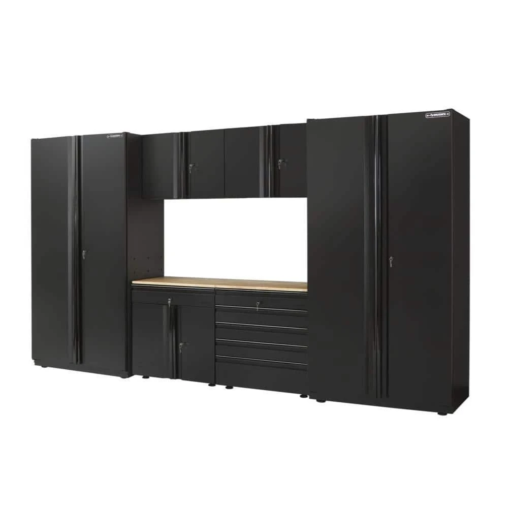 The Husky Heavy Duty Welded Garage Cabinets are built tough for any project. They’re made with rugged 20-Gauge steel and come with Husky’s Lifetime Warranty, so you know they’re built to last. The cabinets come pre-assembled and ready to install – just mount the self-leveling support beam to the wall and then hang wall cabinets on it. The cabinets also all have innovative features that make your work easier and more organized. The tall locker cabinets have cord grommets, 3-way locks, adjustable shelves, an adjustable drawer, and feet that you can level from the inside, even after the cabinet is installed. The wall cabinets also lock and feature adjustable shelves. The base cabinets can easily store and organize your gear and include a solid rubber wood top for extra workspace when needed. The whole set is covered in a black matte powder-coating, which provides a sleek look and helps protect against scratches and everyday wear and tear. The Husky Heavy Duty Welded Garage Cabinet are strong, smart, and perfect for any project.