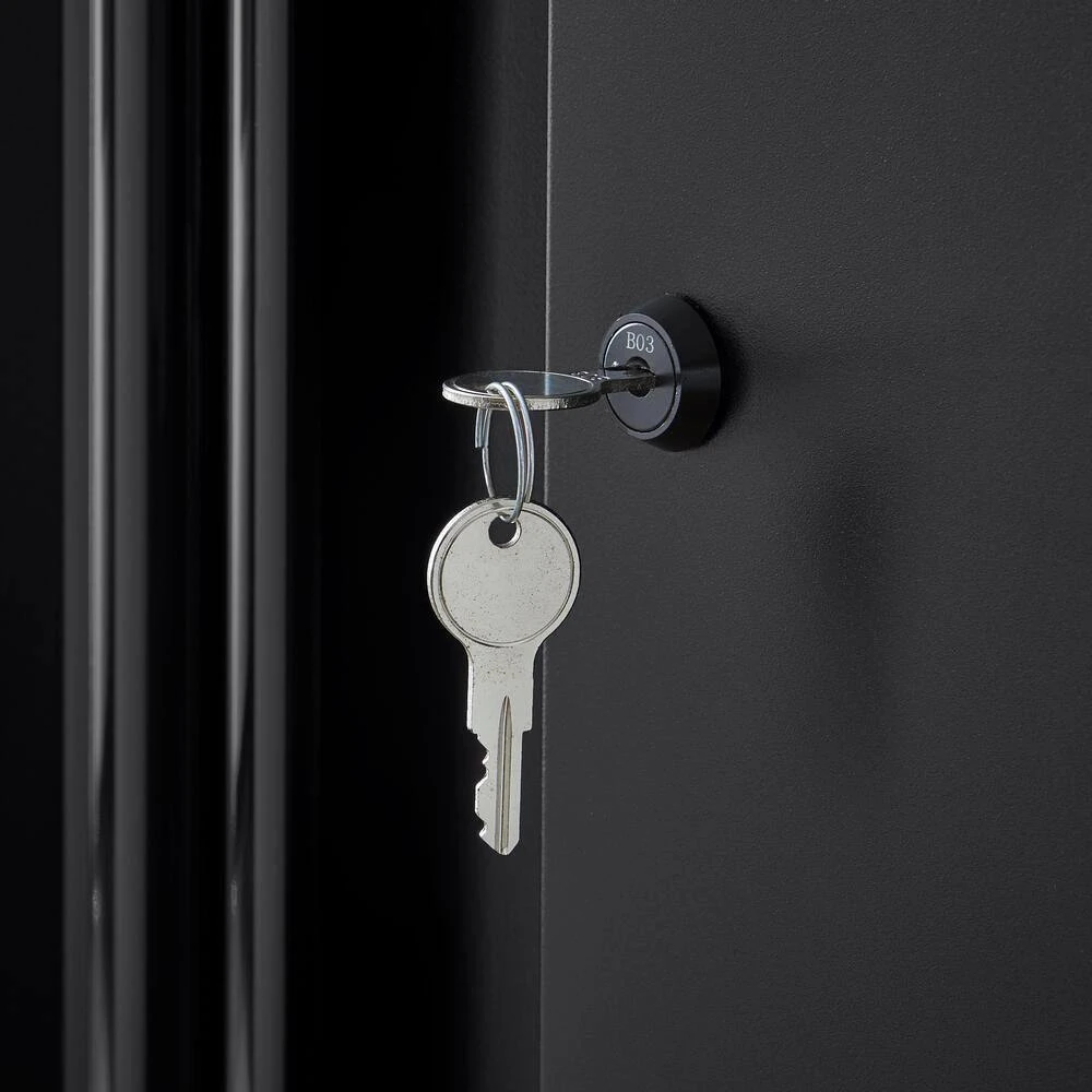 - Tall locker cabinet doors also feature an integrated pegboard for additional storage and the doors open 180° for complete access to the locker’s contents, the bottom of the locker has a kick plate that prevents screws or small parts from rolling under and getting lost and the bottom shelf has an adjustable lip that lifts up to form a basket, keeping balls or other gear from rolling away