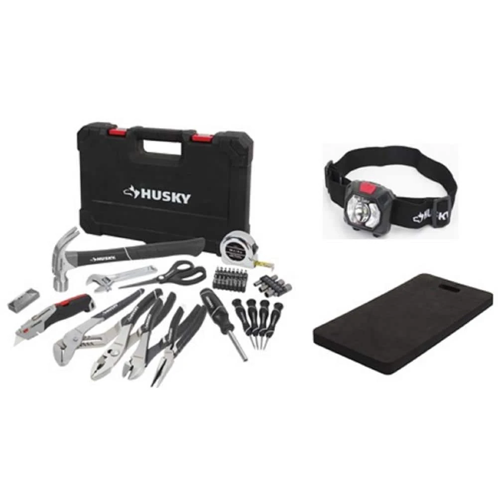 The Husky 60-Piece Home Repair tool set, bundled with a 300-lumen headlamp and kneeling pad is the perfect choice for your repairs at home, workplace, or other activities. The variety of tools in the kit, helps you tackle your projects and tasks with ease. The heat-treated tools provide strength and durability to ensure a long life. The kneeling pad is made of thick NBR closed-cell foam, which keeps its shape over time while resisting absorbed liquids. It is designed for your comfort and can be used indoors or outdoors, such as on the cold ground, steel surfaces, concrete, and wet and dry surfaces. The durable closed-cell foam is resistant to oil and water. It provides comfort as well as knee protection for static kneeling situations, while protecting against common knee injuries on the job by supporting the knees and joints. The 100 Lumens headlamp is a useful tool that allows you to be hands-free while working on your projects or other activities. The headlamp is constructed of tough ABS plastic with an adjustable elastic head strap and an adjustable headlight. There are 4 modes of lighting: high light, low light, red and red flashing. (9) AAA batteries are included.