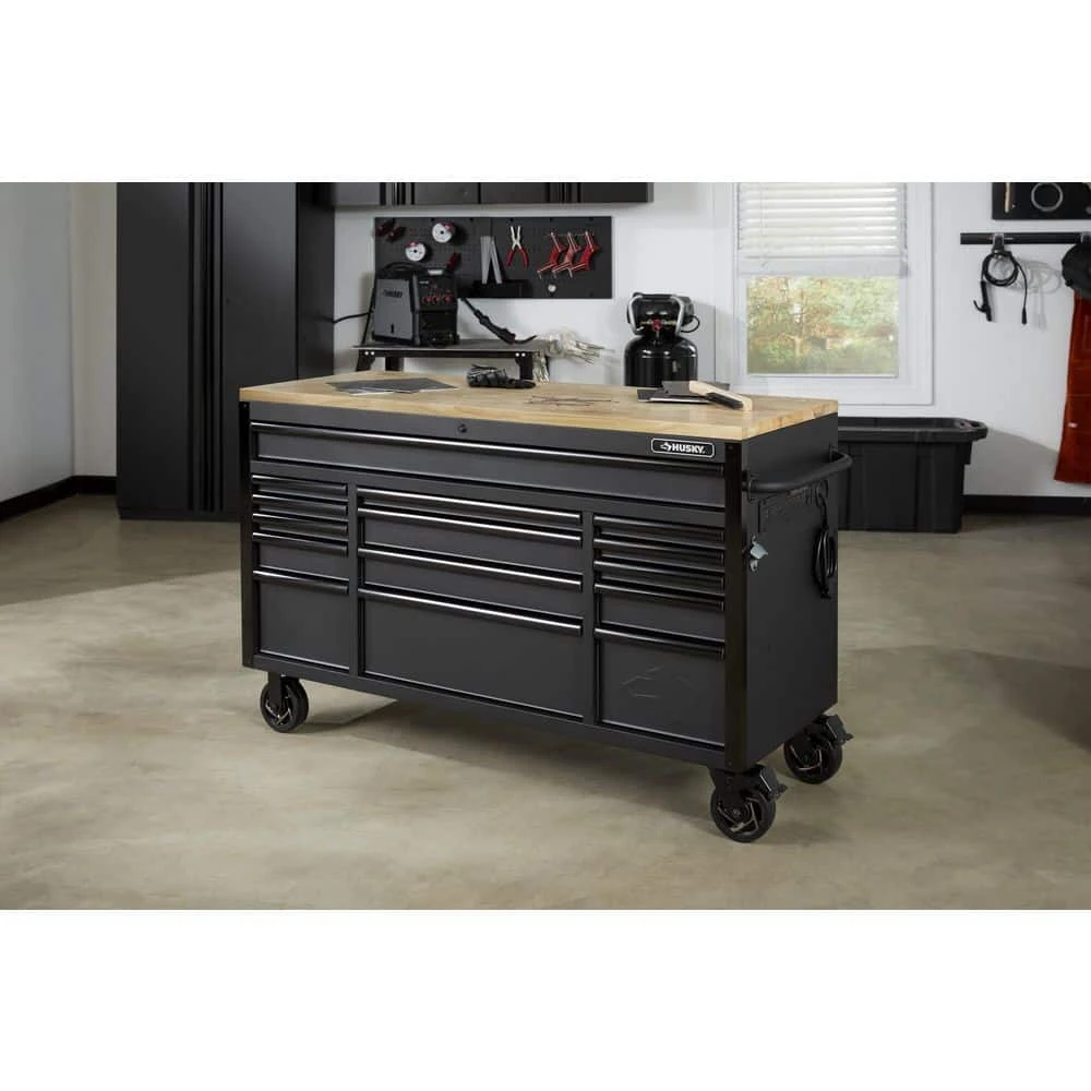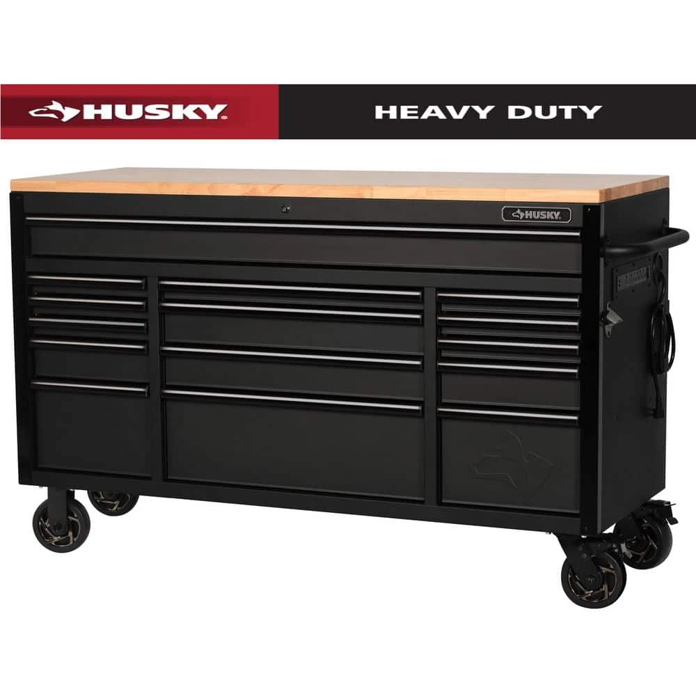 The all new Husky Heavy Duty 61 in. 15-Drawer Mobile Workbench with solid wood top will be a great addition to any garage or workspace. Built to withstand the demands of any workplace setting, this unit is solidly constructed with all-welded 19-Gauge steel. There are also aluminum corner guards fastened in place for further protection against dings and dents. The solid wood top is over 1 in. thick and provides 1,403 sq. in. of workspace. If the need should ever arise, this wood top is sealed on all sides and can also be flipped over. Underneath the work surface are 15-drawers of varying sizes that create 24,187 cu in. of storage space. Each drawer comes equipped with a pre-cut liner, embossed with the Husky logo, to protect and organize all your tools and supplies. All drawers glide effortlessly on 120 lbs. rated ball-bearing slides and feature soft-closing mechanisms to prevent slamming. The full-width drawer and 9 in. D bottom drawers all have a double set of slides to accommodate heavier items. On the right-hand side of the workbench is an integrated power strip with 6 outlets and 2 USB ports that will allow you to charge tools, batteries and other electronic devices. Next to the power strip are cord storage hooks and a bottle opener. Finally, this workbench can be easily moved around the workspace with the large ergonomic handle and heavy-duty 6 in. x 2 in. casters.