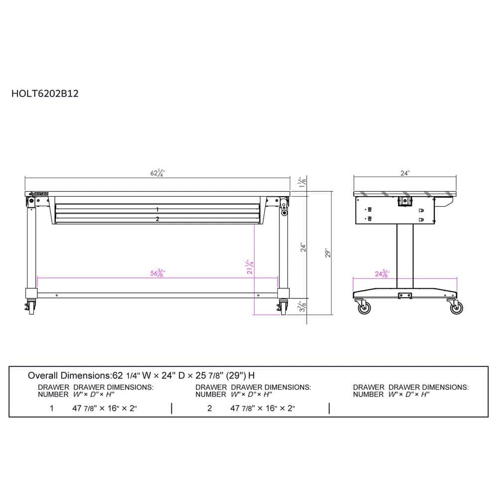 Elevate your work experience with the Husky 62 in. Adjustable-Height Work Table with 2 Drawers. This multi-functional work station features a manual crank that can raise and lower the work surface. The 1.2 in. T, solid wood top is rugged and beautiful and there is plenty of space on the 62 in. W x 24 in. D work surface. The workbench can be assembled with either the four 3 in. x 1 in. polypropylene casters for mobility or attach the 4 leveling feet for use as a stationary table or desk. This work table has plenty of uses around the home, office, hobby room or garage. It is designed with a 300 lbs. weight capacity and an overhang so that you can easily attach your vise grips or cl-Amps while working on a project. This 62 in. Husky Work Table’s contemporary, adjustable-height feature allows you to have the flexibility to sit or stand while working. Research suggests that there are health benefits to alternating between standing and sitting throughout the day because it both decreases body discomfort and increases blood flow. The ergonomic design could also reduce eye and back strain and boost your productivity. The crossbar support can be installed in 2 different locations, depending on your preference. Install the support at the center of the table for an open, 2-sided work area. Or install it along the back of the legs to allow you the versatility of stowing your tool storage and rolling cabinets underneath to further organize your work space.