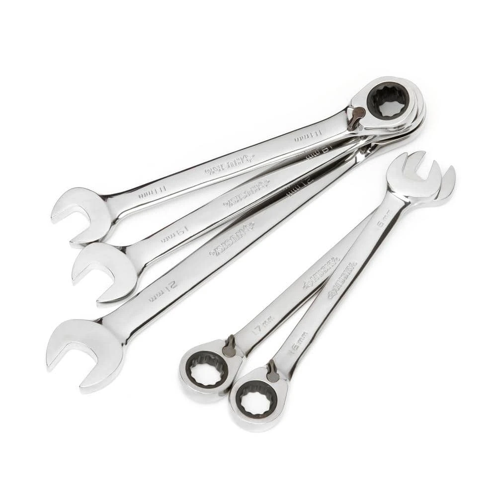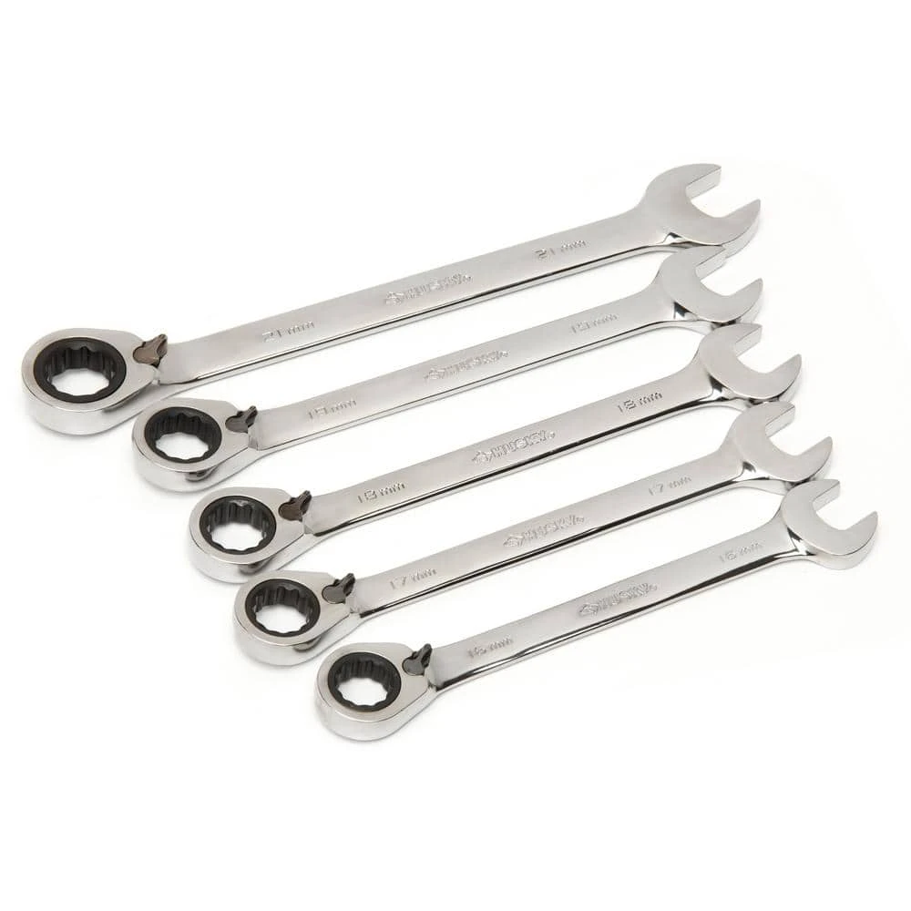 - 5-piece set includes reversible ratcheting wrenches in metric sizes 16mm, 17mm, 18mm, 19mm, and 21 mm
