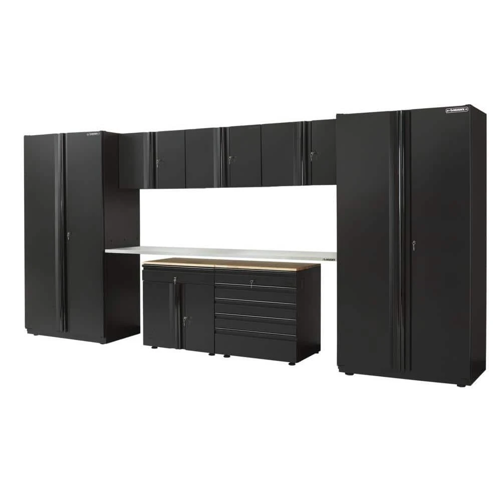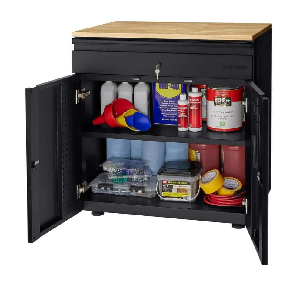 The Husky heavy duty welded garage extra wide cabinets are built tough for any project. They’re made with rugged 20-Gauge steel and come with Husky’s lifetime warranty, so you know they’re built to last. The cabinets come pre-assembled and ready to install – just mount the self-leveling support beam to the wall and then hang wall cabinets on it. The cabinets also all have innovative features that make your work easier and more organized. The tall locker cabinets have cord grommets, 3-way locks, adjustable shelves, an adjustable drawer and feet that you can level from the inside, even after the cabinet is installed. The wall cabinets also lock and feature shelves. The base cabinets can easily store and organize your gear and include a solid rubber steel top for extra workspace when needed. The whole set is covered in a black matte powder-coating, which provides a sleek look and helps protect against scratches and everyday wear and tear. The Husky heavy duty welded garage extra wide cabinet are strong, smart, and perfect for any project.