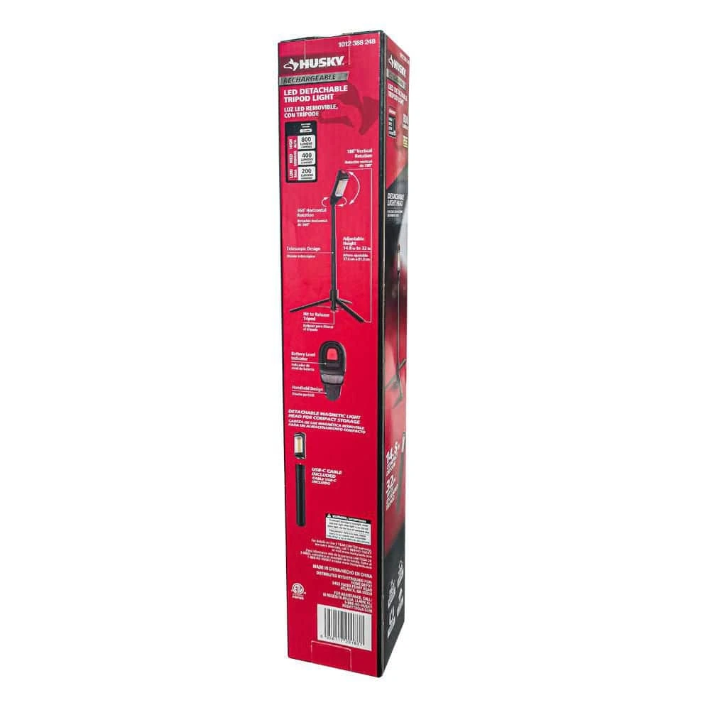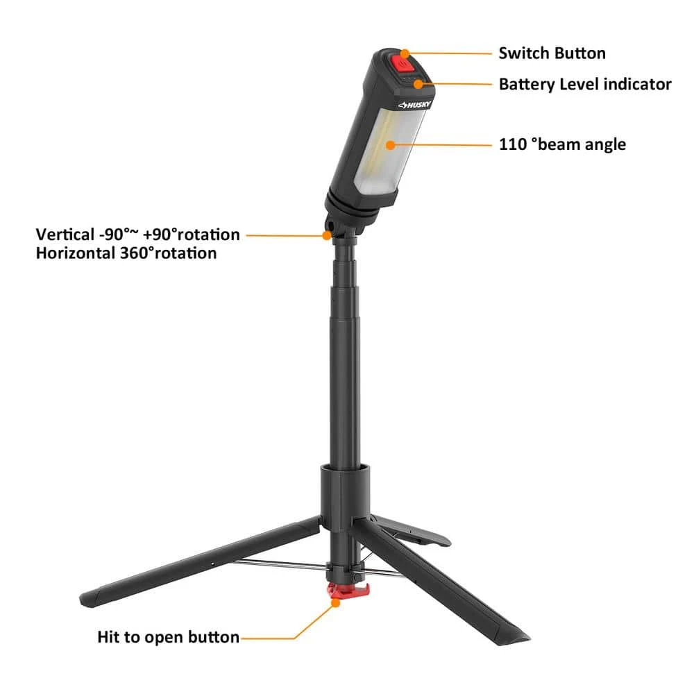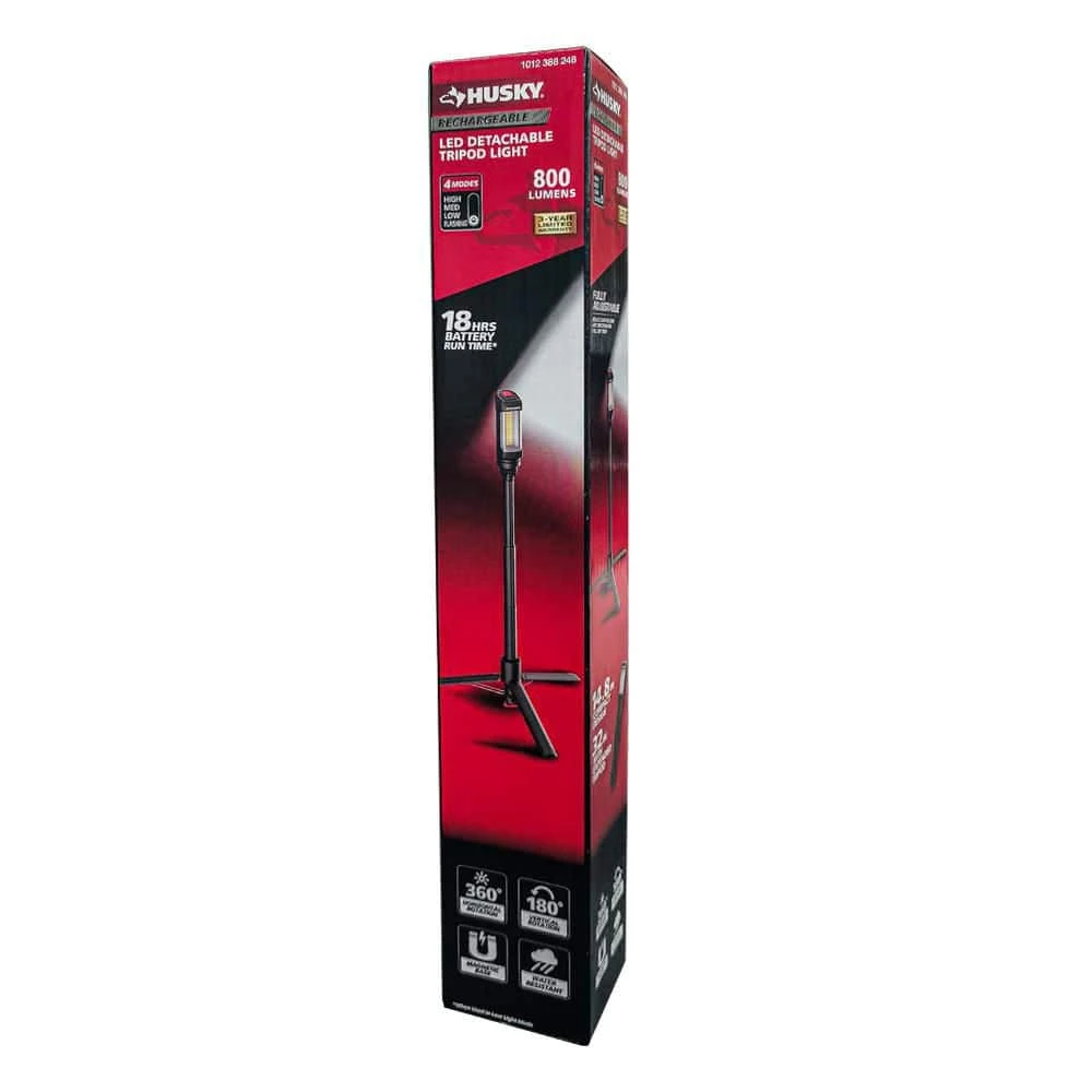 The Husky 800-Lumen LED Detachable Tripod Work Light is built for versatility and convenience. Featuring a 360° horizontally and 180° vertically adjustable lamp head, this powerful 800-lumen work light is perfect for garage or workshop tasks.It’s rechargeable via the included USB-C cable and comes with a battery level indicator. The detachable light head has a magnetic base, allowing it to easily attach to any metal surface, with a telescoping tripod and 1/4 in. screw nuts for secure mounting.This light is designed for easy setup, Simply hit the bottom at the base to release the tripod, making it ideal for outdoor use.
