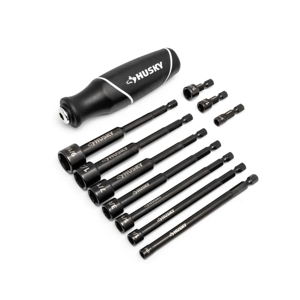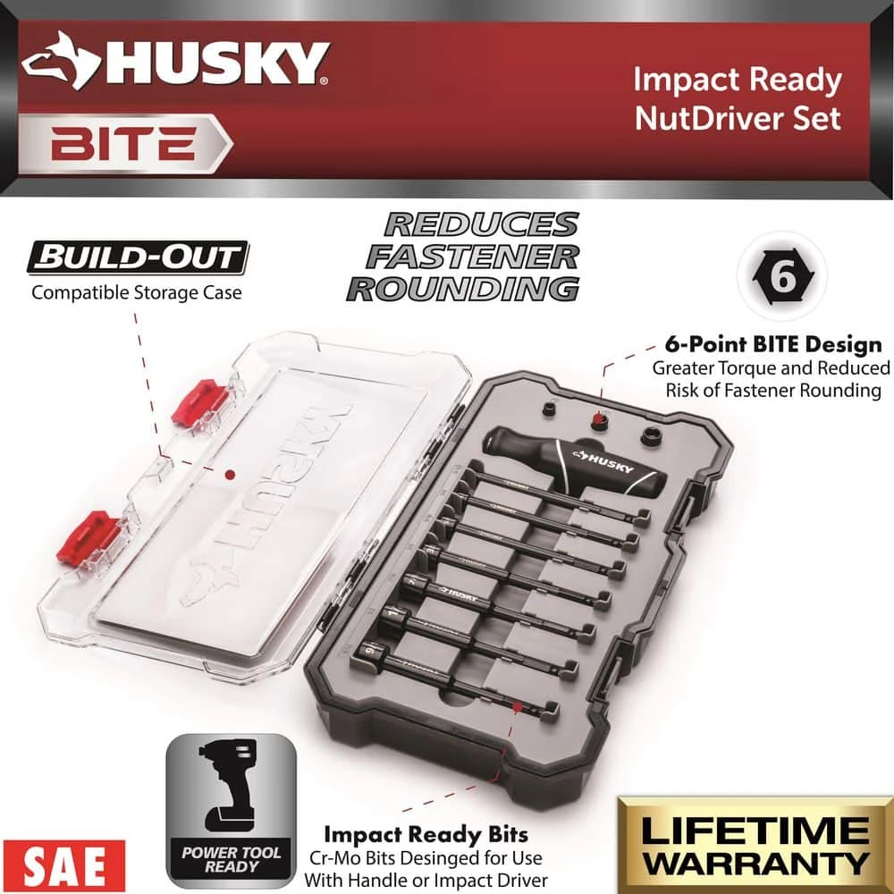 The new Husky BITE 10-Piece SAE Nut Driver Set features 10-interchangeable drivers and an ergonomic, cushion-grip handle. Driver bits are constructed of chromoly for superior durability. The cushion grip handle helps reduce fatigue and provides additional comfort for ease of use. The driver ends feature a unique gripping profile, allowing the user to apply 2x more torque before a fastener rounds vs. a standard driver end. Hollow shafts provide higher maximum bolt clearance, allowing access to longer bolts or threaded rods.