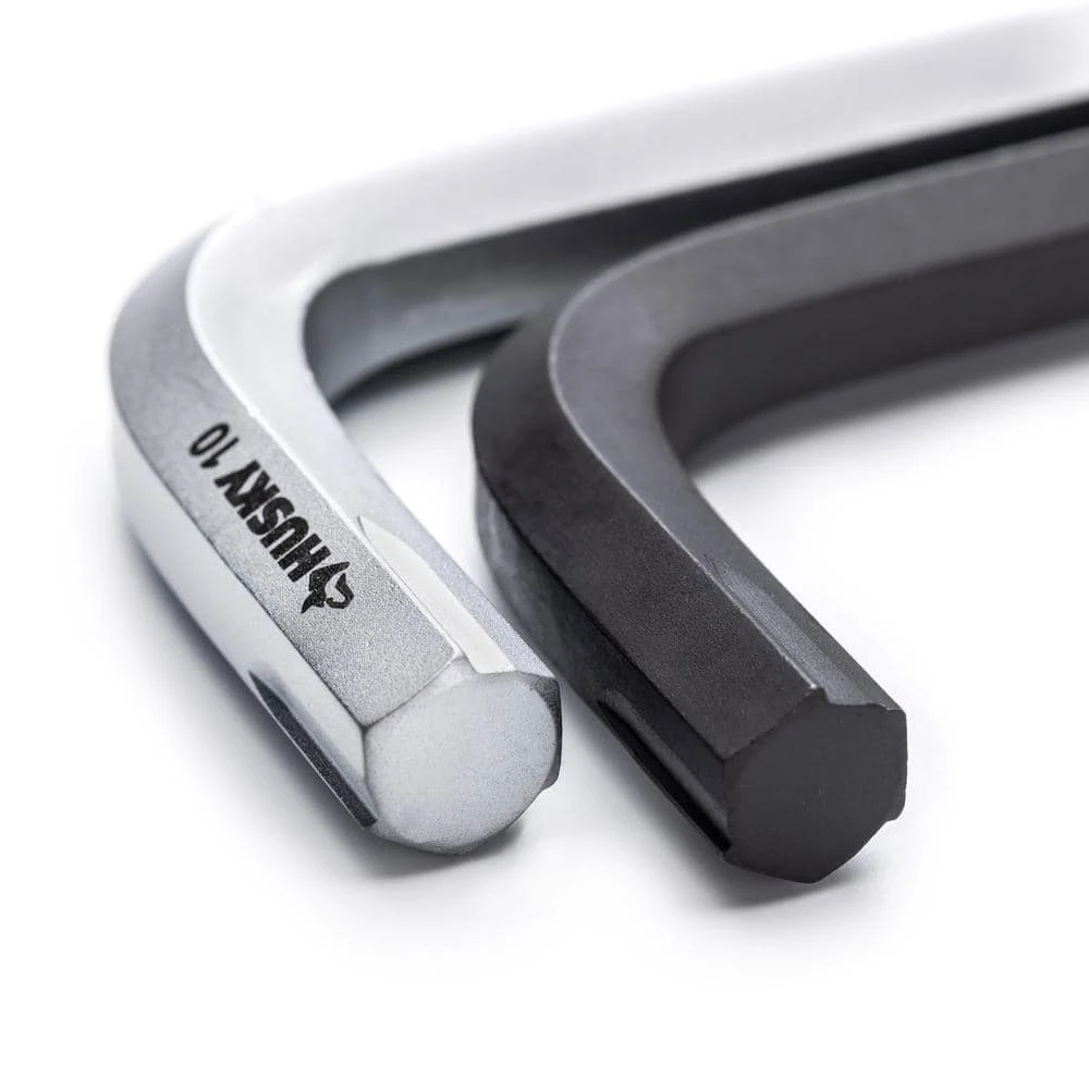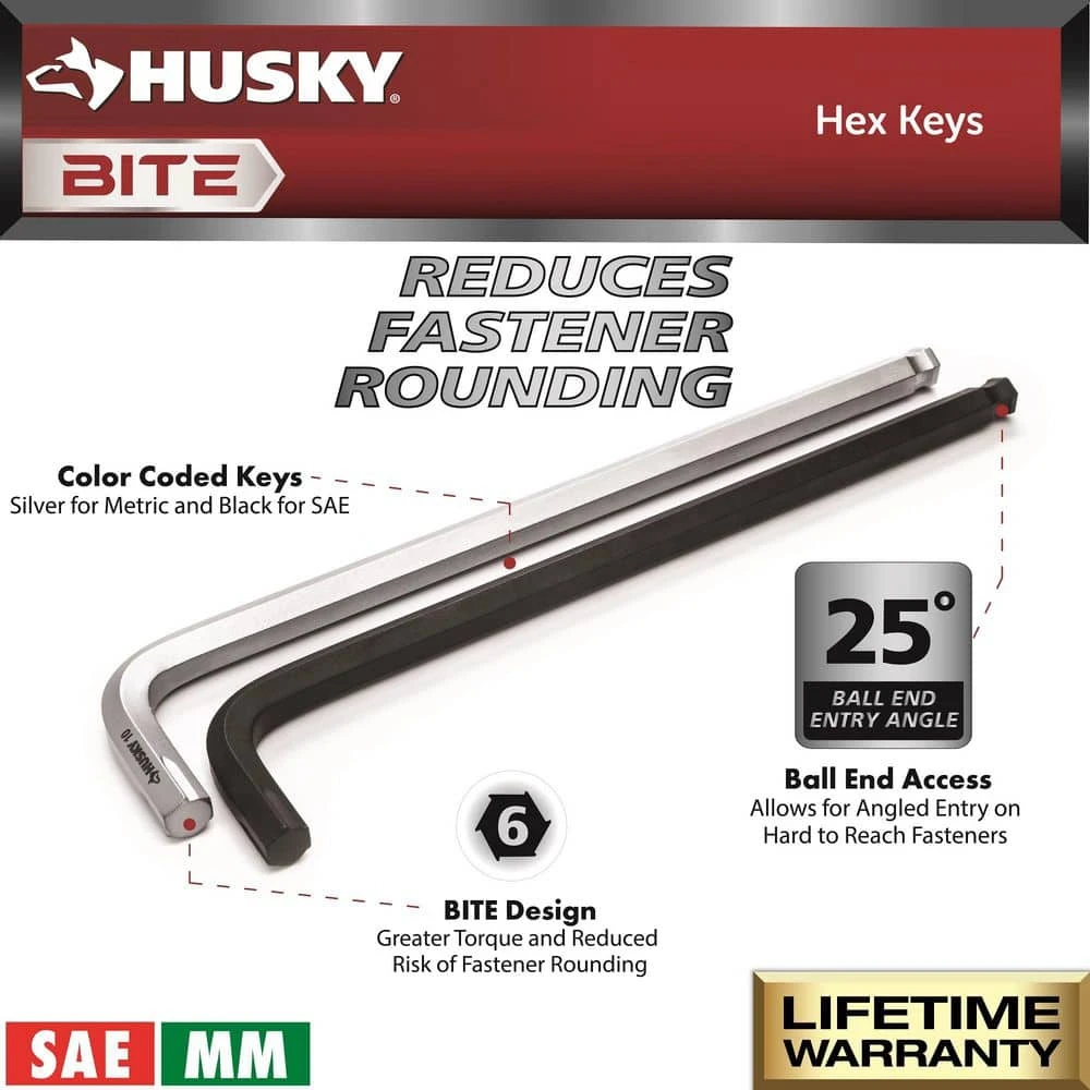 The Husky BITE 18-Piece Non-Slip Hex Key Set includes hex keys made from a durable steel alloy for reduced wear. Featuring a gripping end for 10% more applicable torque and a ball end design for greater access, the keys resist rotational distortion and offer a variety of SAE and metric sizes. The finish provides resistance to corrosion.