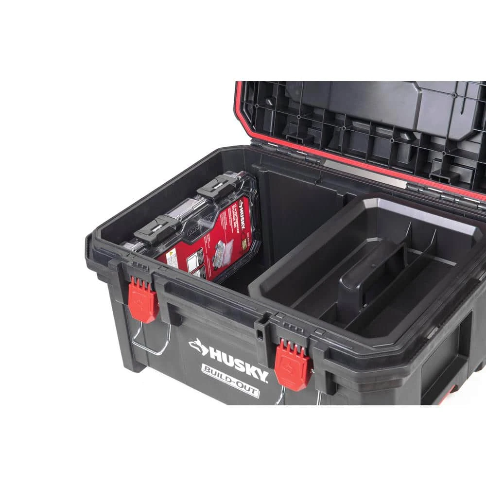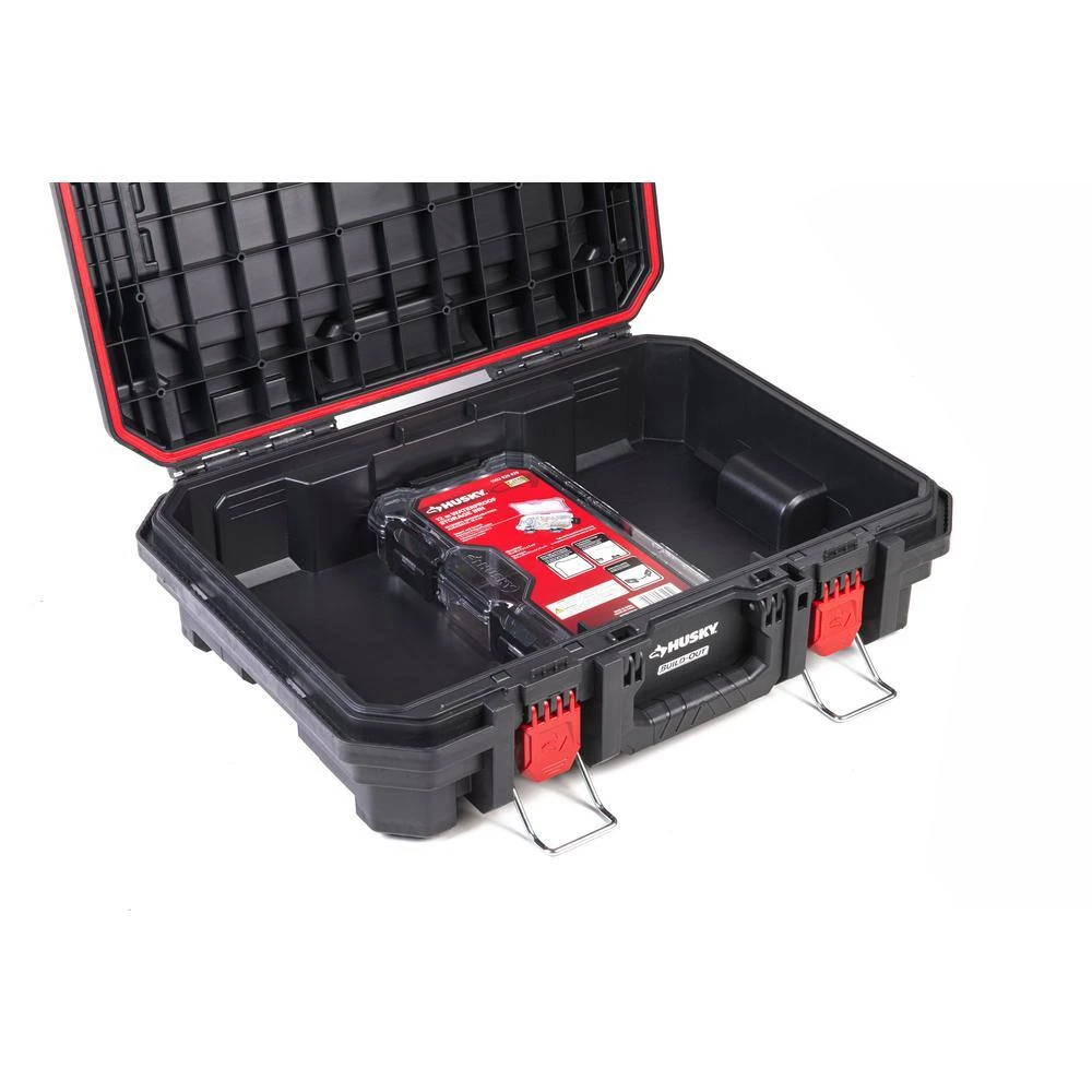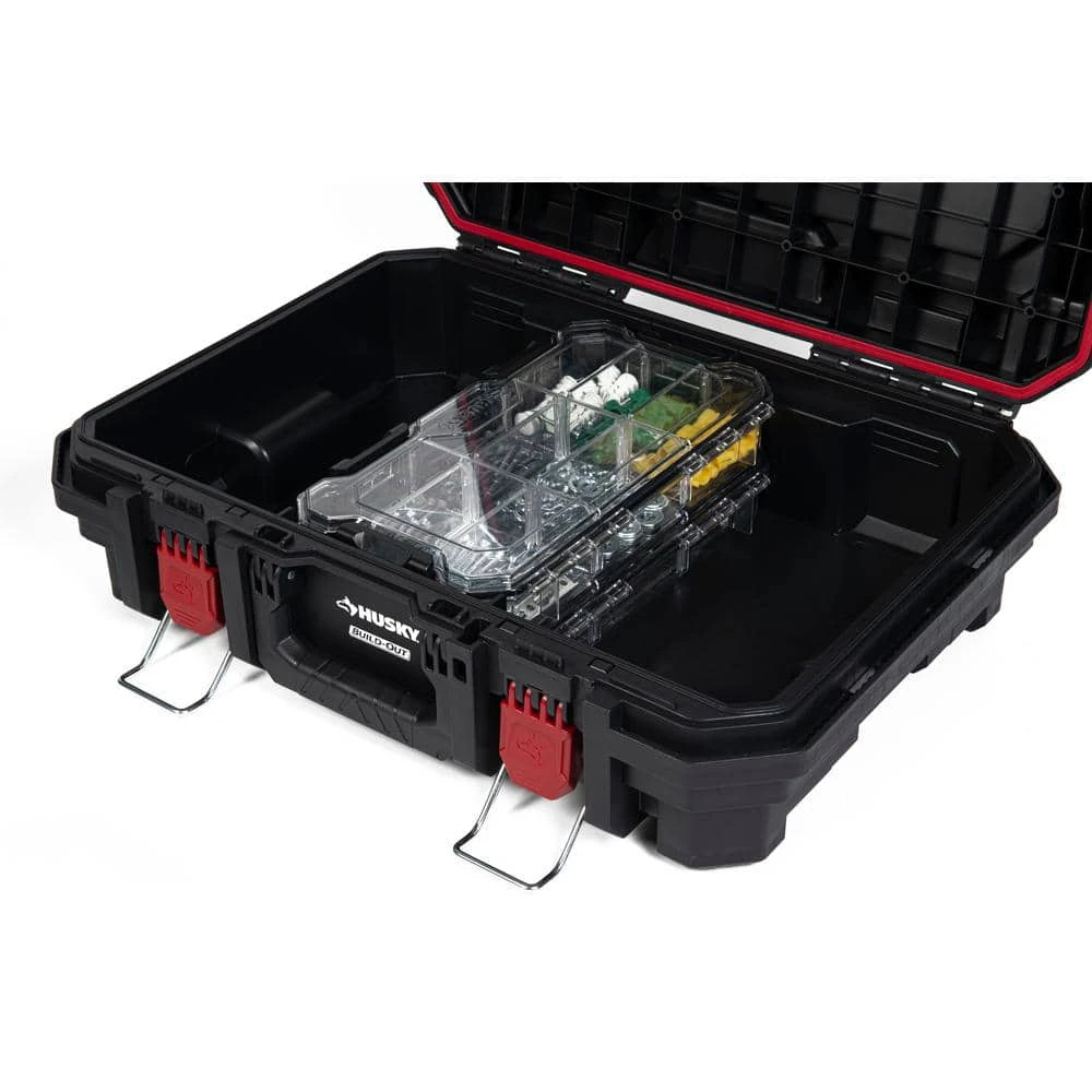 Protect your components against the elements with the Husky 12-inch Waterproof Storage Bin. Constructed from heavy-duty polymer with over-center latches and a silicone O-ring waterproof seal for long-lasting durability. Removable dividers inside the bin allow for customized storage. The Waterproof Storage Bin works for standalone organization and also integrates into Husky Build-Out tool boxes.