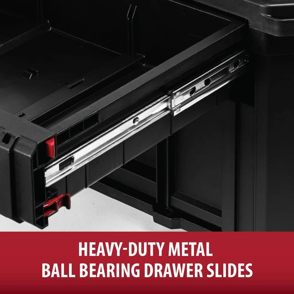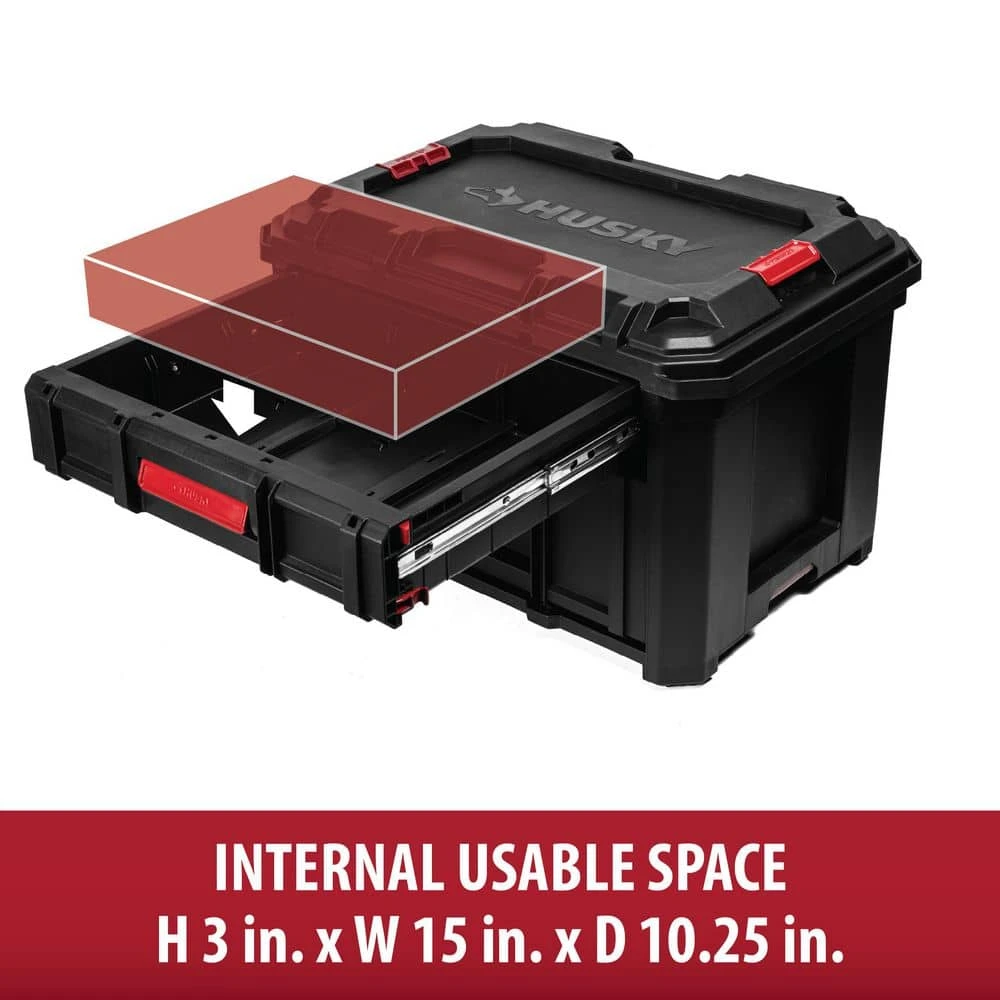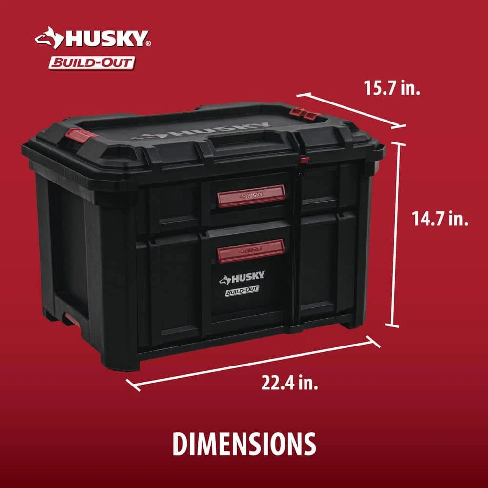 Get quick front access to your equipment with the Husky Build-Out 2-Drawer Tool Box. Each drawer has an independent latching mechanism to stop unwanted opening during transport. The top drawer includes configurable dividers to keep your tools and projects organized. The deeper bottom drawer is open with no dividers for oversize tools and components. With heavy-duty metal ball bearing slides and impact-resistant construction, this drawered unit features a total loading capacity of 50 lbs. The built-in pass-through security feature with included metal security bar ensure your tools stay safe and secure. Expand your storage system by connecting hooks and other accessories to the integrated accessory rail. The Husky Build-Out system creates customizable modular storage that gets you and your tools to the job site faster. The system includes tool boxes organizers, crates and accessories, all designed to seamlessly secure together in many different configurations.