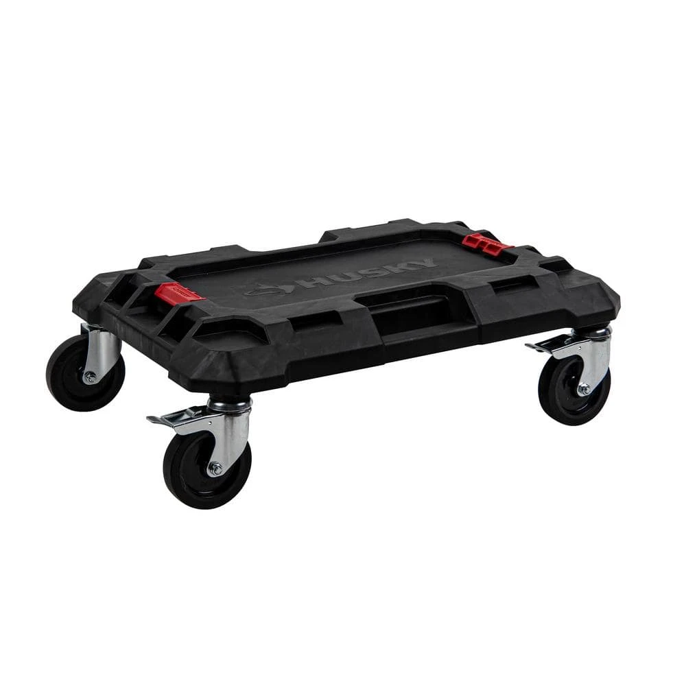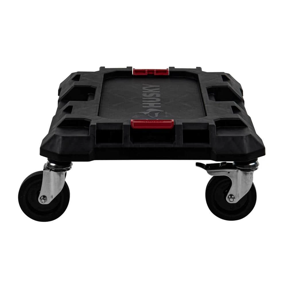 The Husky Build-Out Multipurpose Dolly is perfect for moving the Build-Out system around the shop, warehouse, office or garage. The dual lock and release stacking mechanism makes it simple to securely stack and quickly reconfigure your Build-Out system. The Multipurpose Dolly has a 300 lbs. total loading capacity with impact-resistant material and heavy-duty swivel casters. The non-marking casters are equipped with independent brakes to ensure stable positioning and smooth movement. The dolly comes with integrated carrying handles and 4 pass-through connection points. Stack any configuration of Build-Out components to create your ideal storage solution.