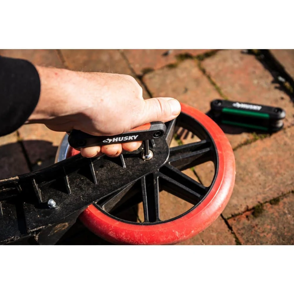 The Husky 8-Piece Metric Folding Hex Key Set is made of alloy steel for strength. It includes a range of metric hex keys that resist rotational distortion and fold up into the handle for efficient organization. The finish provides resistance to corrosion.