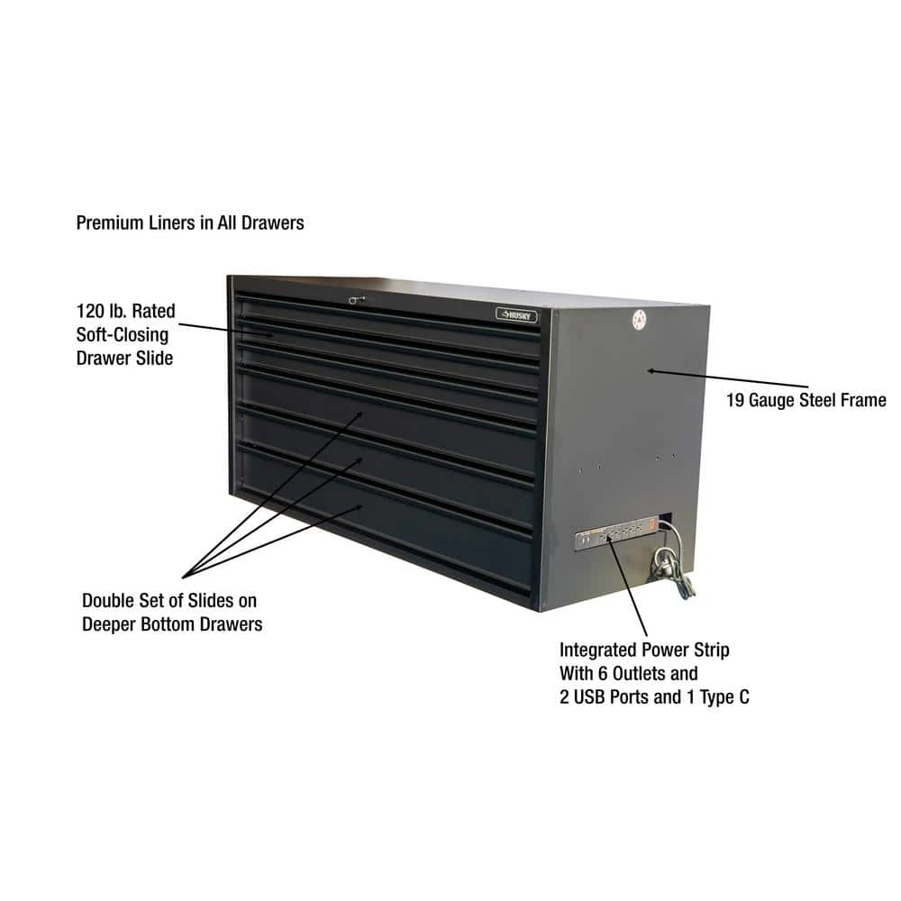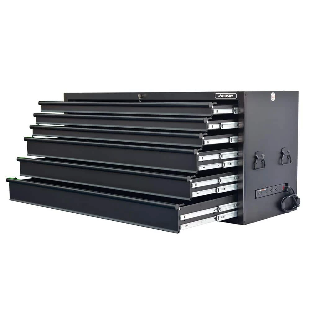 The all-new Husky Heavy-Duty modular tool storage system has arrived at The Home Depot. Designed to meet the demands of professional mechanics and enthusiasts, this collection is a value compared to the industry’s high-end steel storage cabinets. The Husky Heavy-Duty Top Chest is 30 in. tall and intended to create a secured work storage space above the Husky Heavy-Duty 62 in. x W 24 in. D Heavy-Duty 10-Drawer Mobile Workbench with Stainless Steel Work Top (sold separately). This double-walled top chest is constructed with a welded 19 Gauge body and has 6-drawers. The drawers are equipped with 120 lb. soft closing slides and the bottom 3 drawers have double slides for heavier items. This has 30,018 cu. in. storage capacity and 1,200 lb. load capacity. There is also a magnetic power center on side wall with 6 outlets, 2 USB ports and 1 USB-C ports to power tools and electronic devices. Workplace security has also been prioritized with a Y11 key and lock system. Look no further, the Husky Heavy-Duty hutch will be a great addition to the new modular system that is new at the Home Depot.