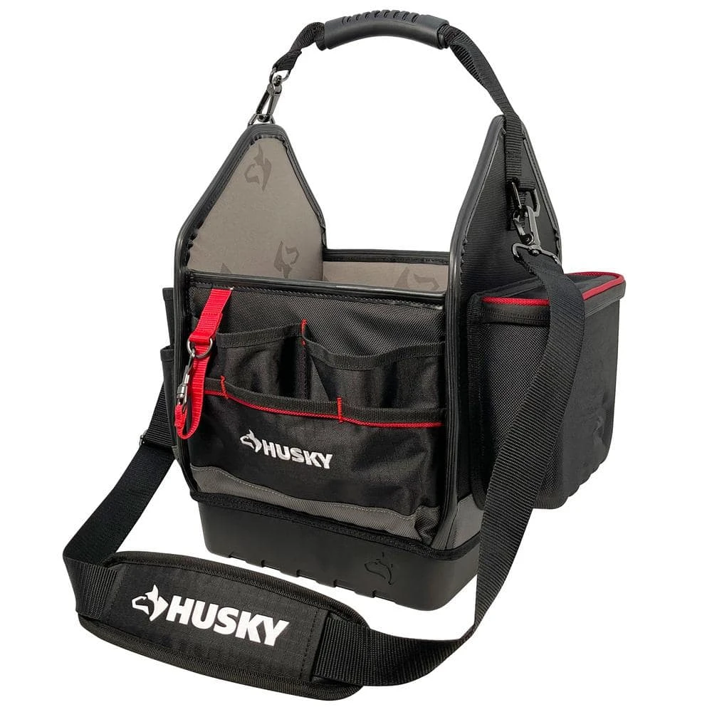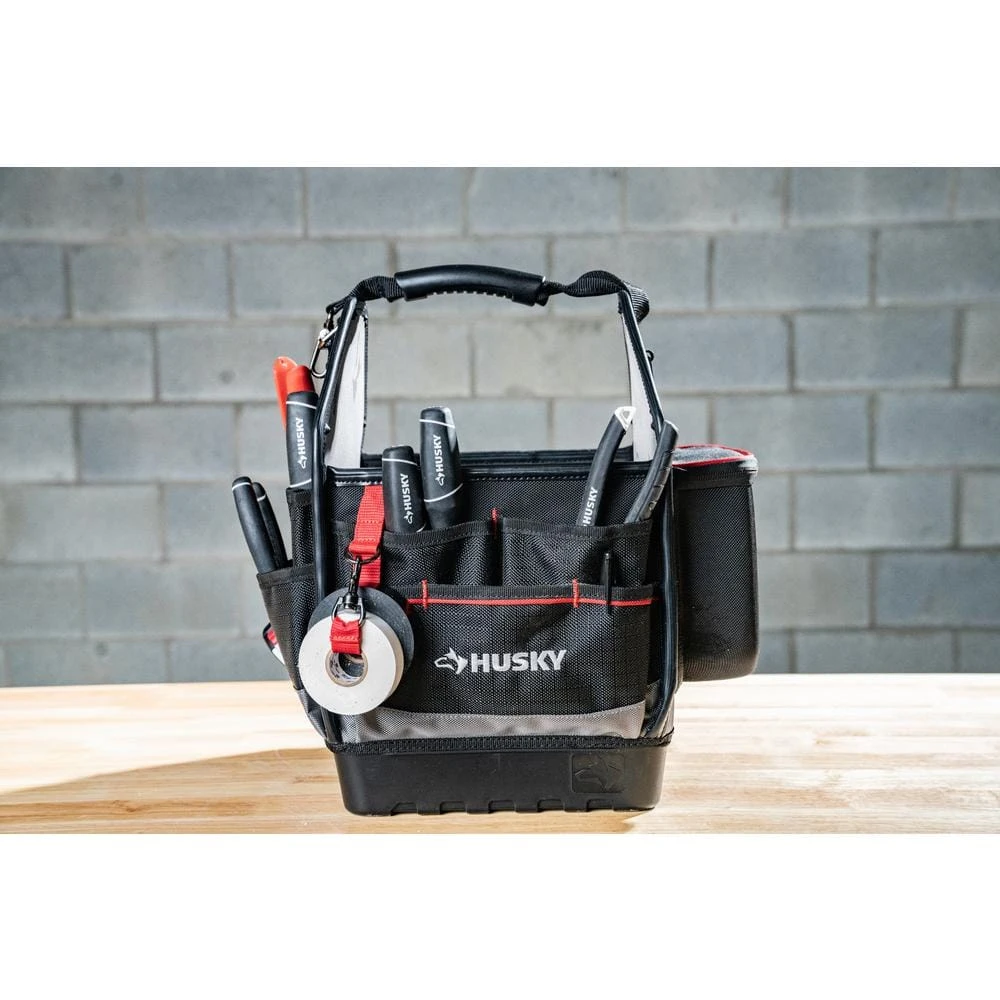 Built for the PRO, the 10 in. Tool Tote that is built for the PRO. The tote is constructed of durable 1680D Polyester, reinforced ripstop pockets and waterproof hard base to withstand everyday jobsite use. The 10 in. opening, removable wall and quick-disconnect handle allow for visibility and easy access to your tools. The 10 in. Tool Tote includes an easy-access tape clip, tape roll tether, and 40 total pockets to organize a variety of tools.