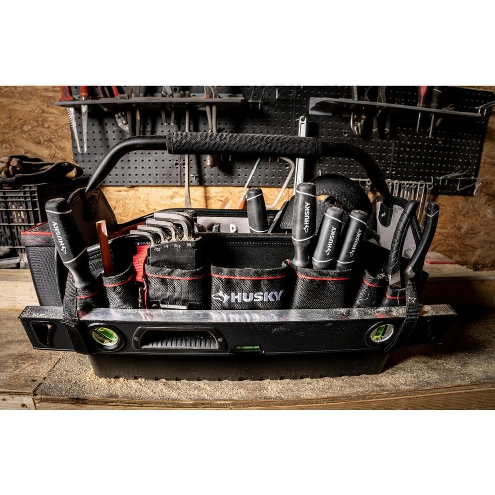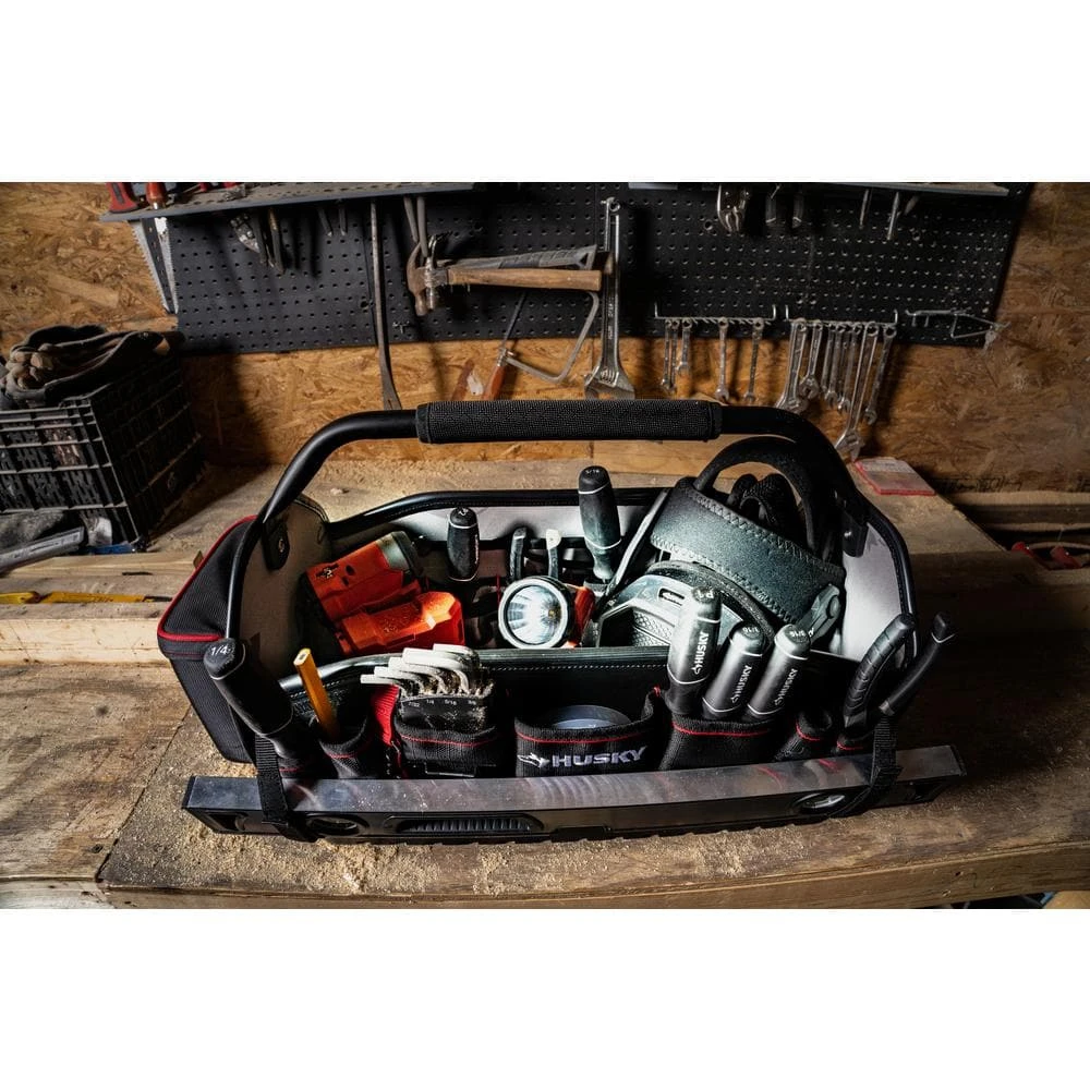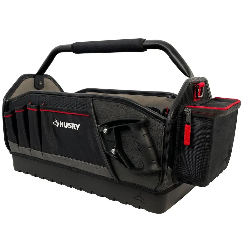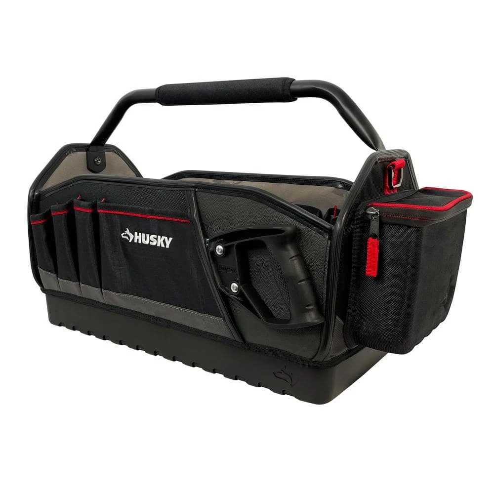 Built for the PRO, the 20 in. All-Trade Tool Tote is constructed of durable 1680D Polyester, reinforced ripstop pockets and waterproof hard base to withstand everyday jobsite usage. The 20 in. opening, removable wall and quick-disconnect handle allow for visibility and easy access to your tools. The 20 in. Tool Tote includes an easy-access tape clip, tape roll tether, and 31 total pockets to organize a variety of tools.