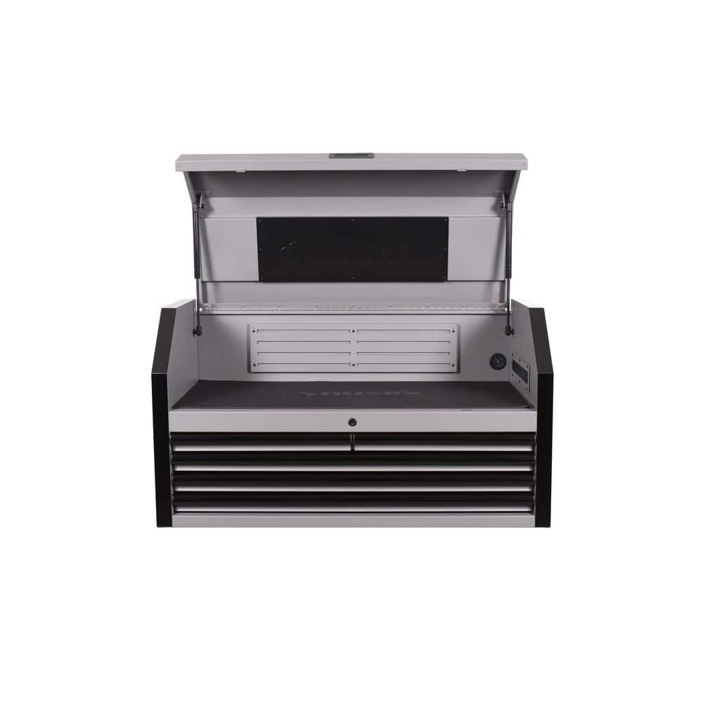 The Heavy Duty 42 in. W 5-Drawer Matte Gray Top Tool Chest has arrived. This chest is constructed of 19-gauge steel and finished with a matte gray powder coat. The unit is equipped with soft-closing 100 lb. rated ball-bearing slides to ensure drawers do not slam closed. Each drawer also has a pre-cut thick liner embossed with the Husky logo. Inside the top till is an integrated power strip with 6 outlets, 1 USB-A, and 1 USB-C port to charge tools, batteries, and other electronic devices.