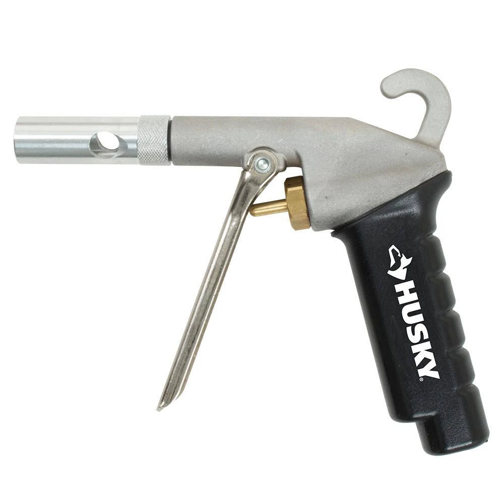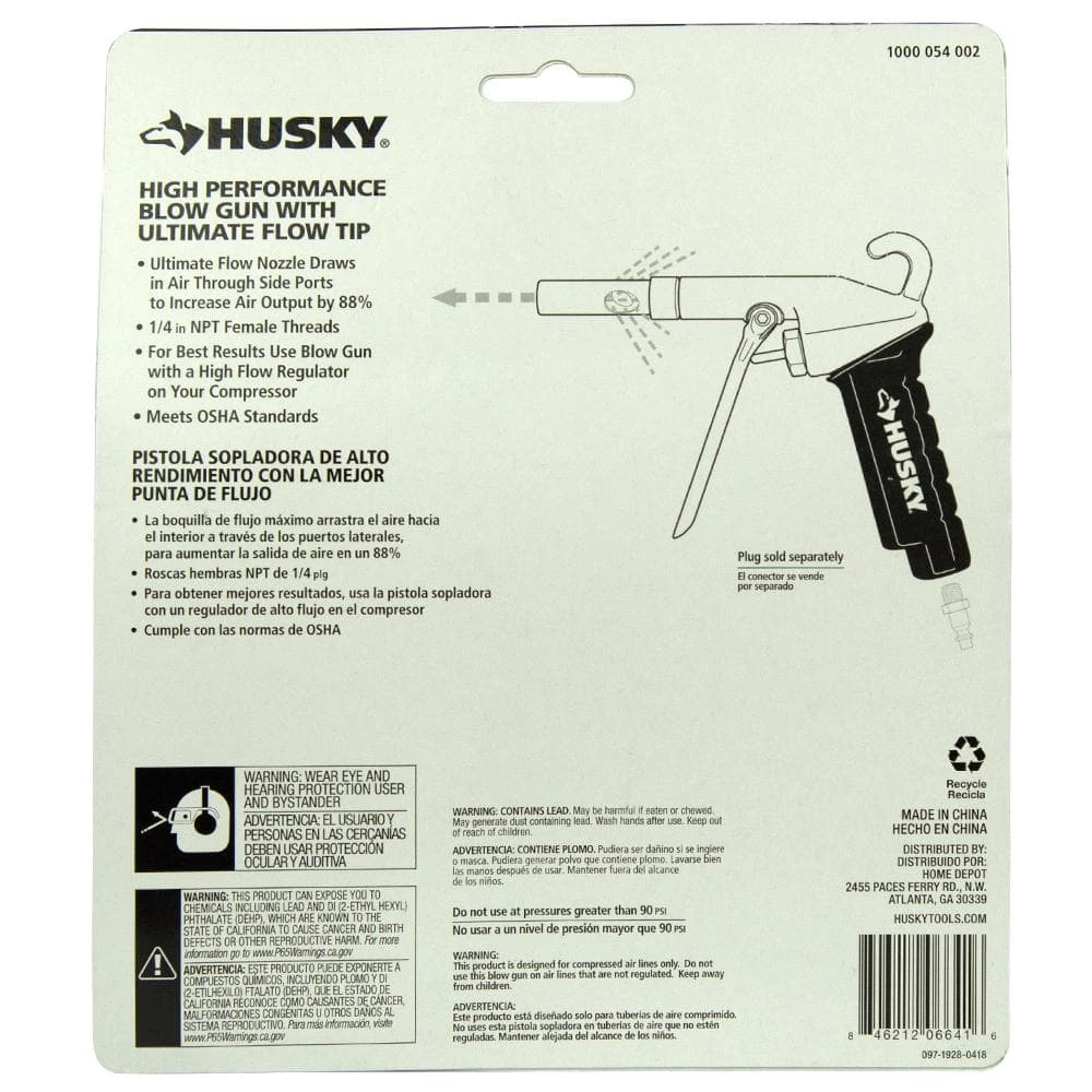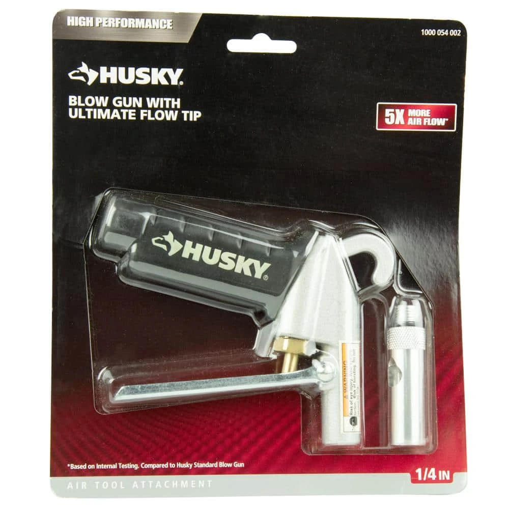 Get the ultimate air flow with this Husky High Performance Blow Gun. This reliable tool delivers 92 SCFM and 88% more air flow than standard blow guns. The ultimate flow tip draws in air through the side ports, increasing air delivery and providing more than enough power to clean large workshop areas, outdoor furniture, large machinery, lawn mower decks and heavy equipment. It comes with a large storage hook for easy access and meets OSHA standards.