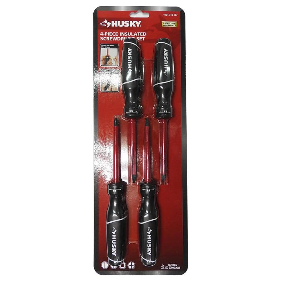 The Husky 4-Piece Insulated Screwdriver Set includes 1 slotted screwdriver, 1 Philips screwdriver, 1 Square screwdriver and 1 Combo Tip screwdriver for your fastening work. The handle is new designed cushion grip handle to provide greater torque and increased comfort, with a unique design to eliminate grip slippage during high-torque applications. The tip size markings are hot stamped on the end of the handle for easy identification, while the alloy steel blades are heat treated for strength and the precision formed tips ensure an accurate fit to limit cam-out. The patented design of wire stripper and wire bending function are very useful and convenient on 12 AWG and 14 AWG for electrician and DIYer. Husky insulated screwdriver exceeds IEC 60900 and ASTM F1505 standards for insulation.