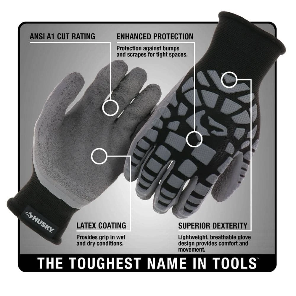 This glove has a gray nylon shell that is light weight and breathable. Latex dip provides excellent grip in both dry and wet conditions. Low profile latex TPR offers back of hand protection for work in small and tight spaces.