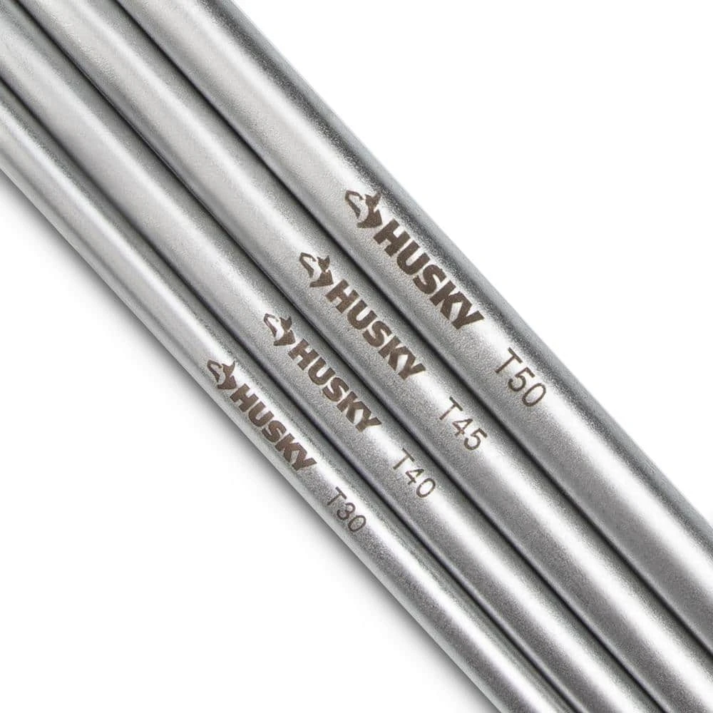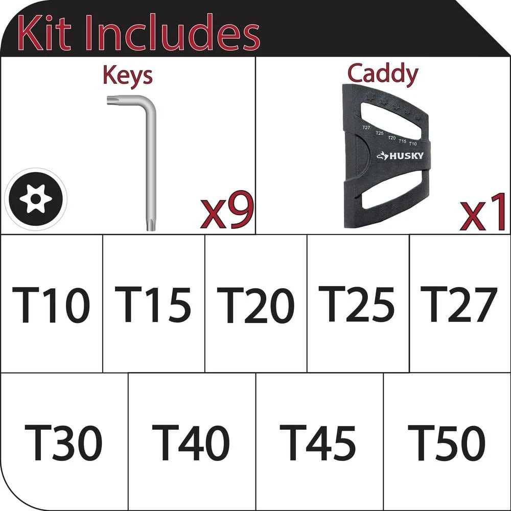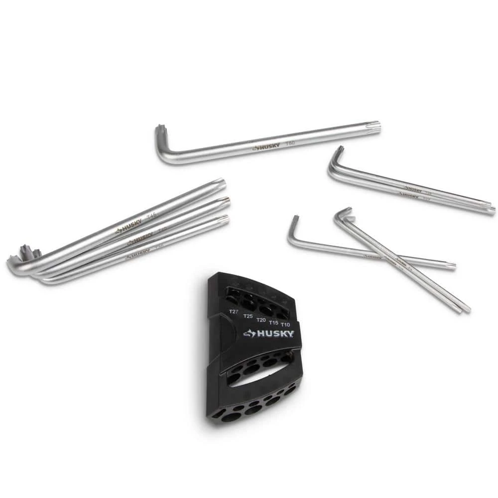 This set of Torx keys from Husky covers 9 of the most commonly found Torx fastener sizes. Each key features a magnetic long arm that works with standard Torx fasteners and a short arm that works with tamperproof Torx fasteners. Heat treated and formed from S2 tool steel, these keys are durable enough to stand up to a lifetime of use.