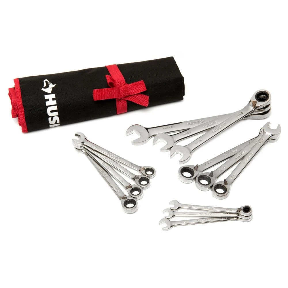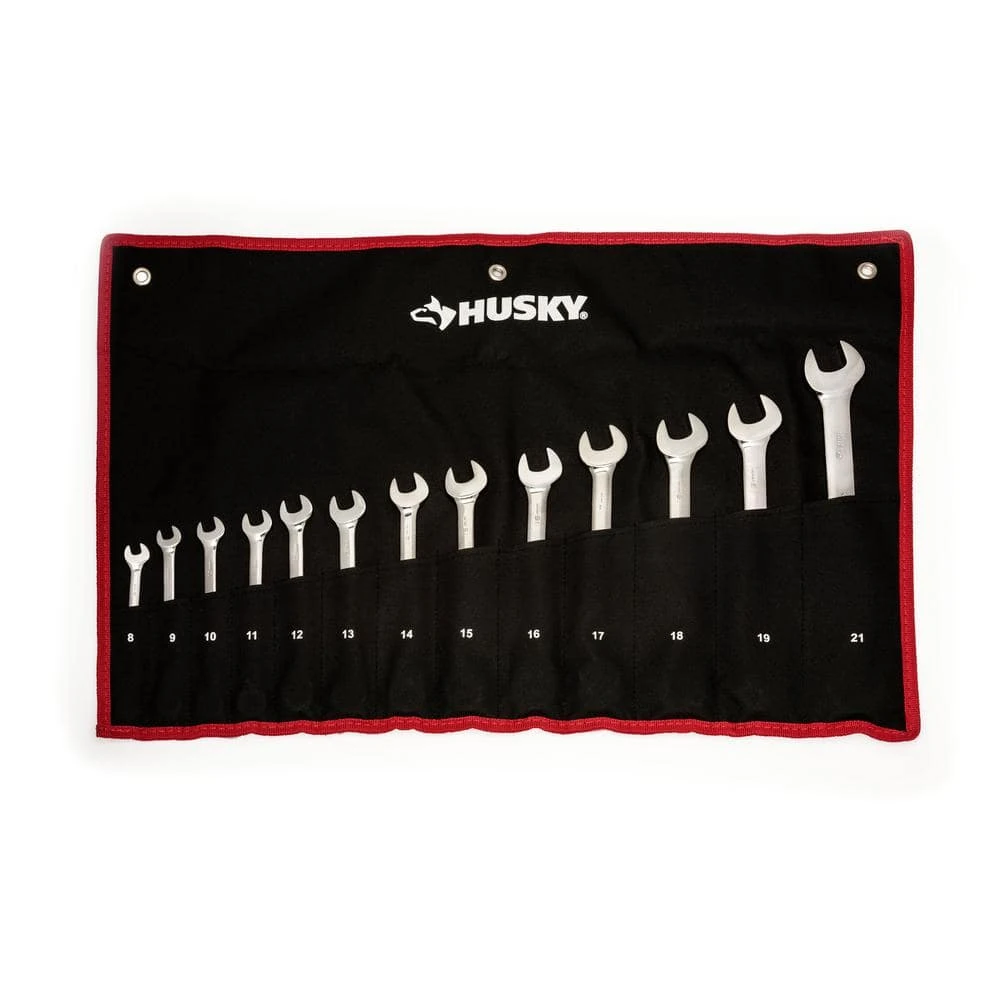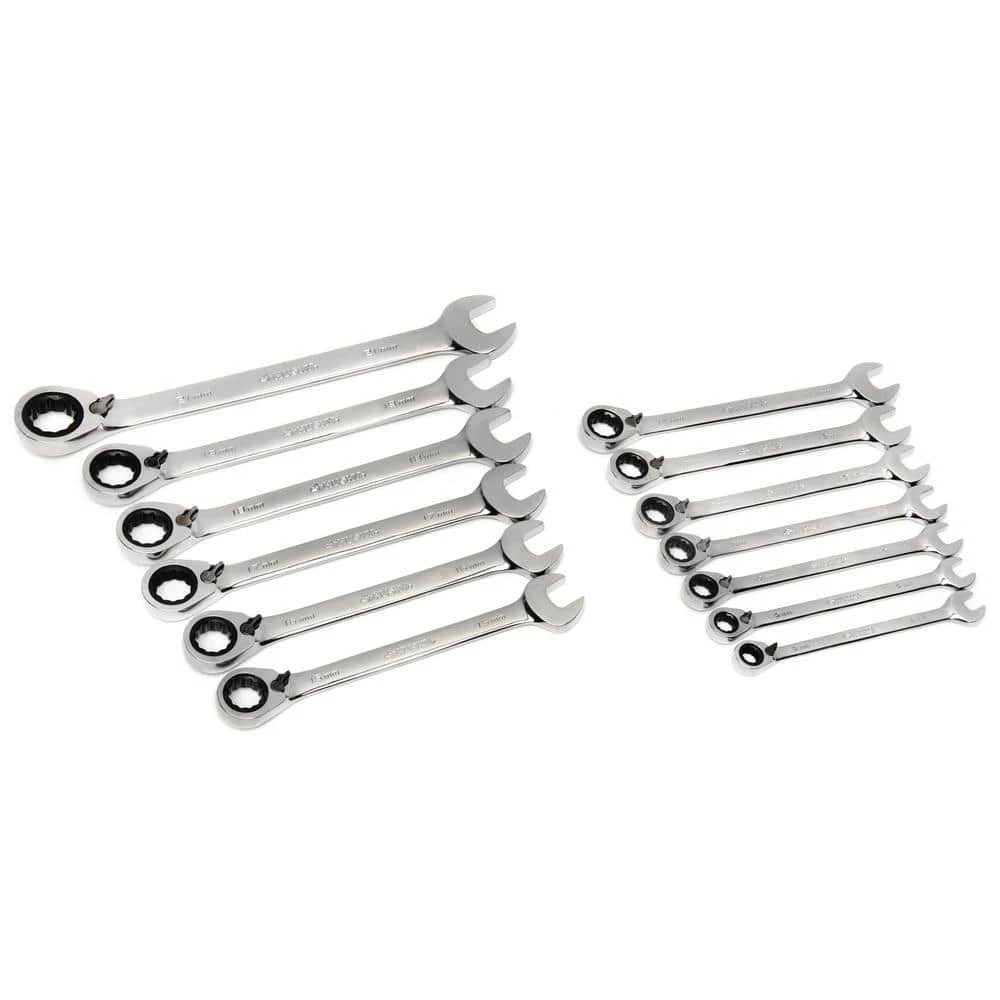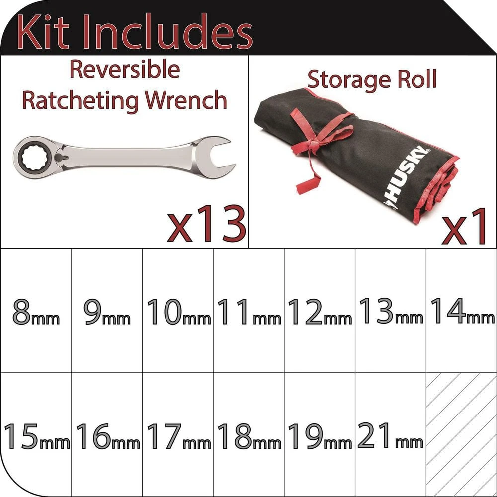 - 13-piece set includes reversible ratcheting wrenches in metric sizes 8mm, 9mm, 10mm, 11mm, 12mm, 13mm, 14mm, 15mm, 16mm, 17mm, 18mm, 19mm, and 21mm