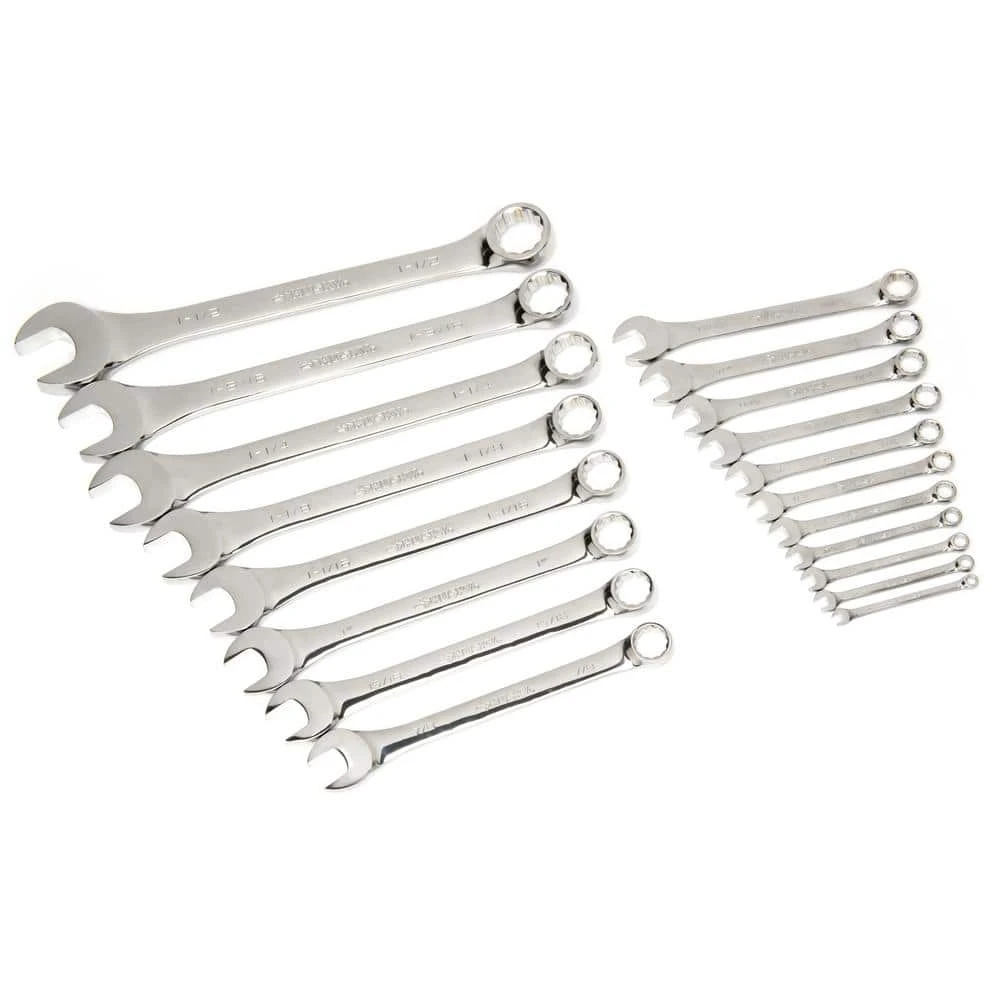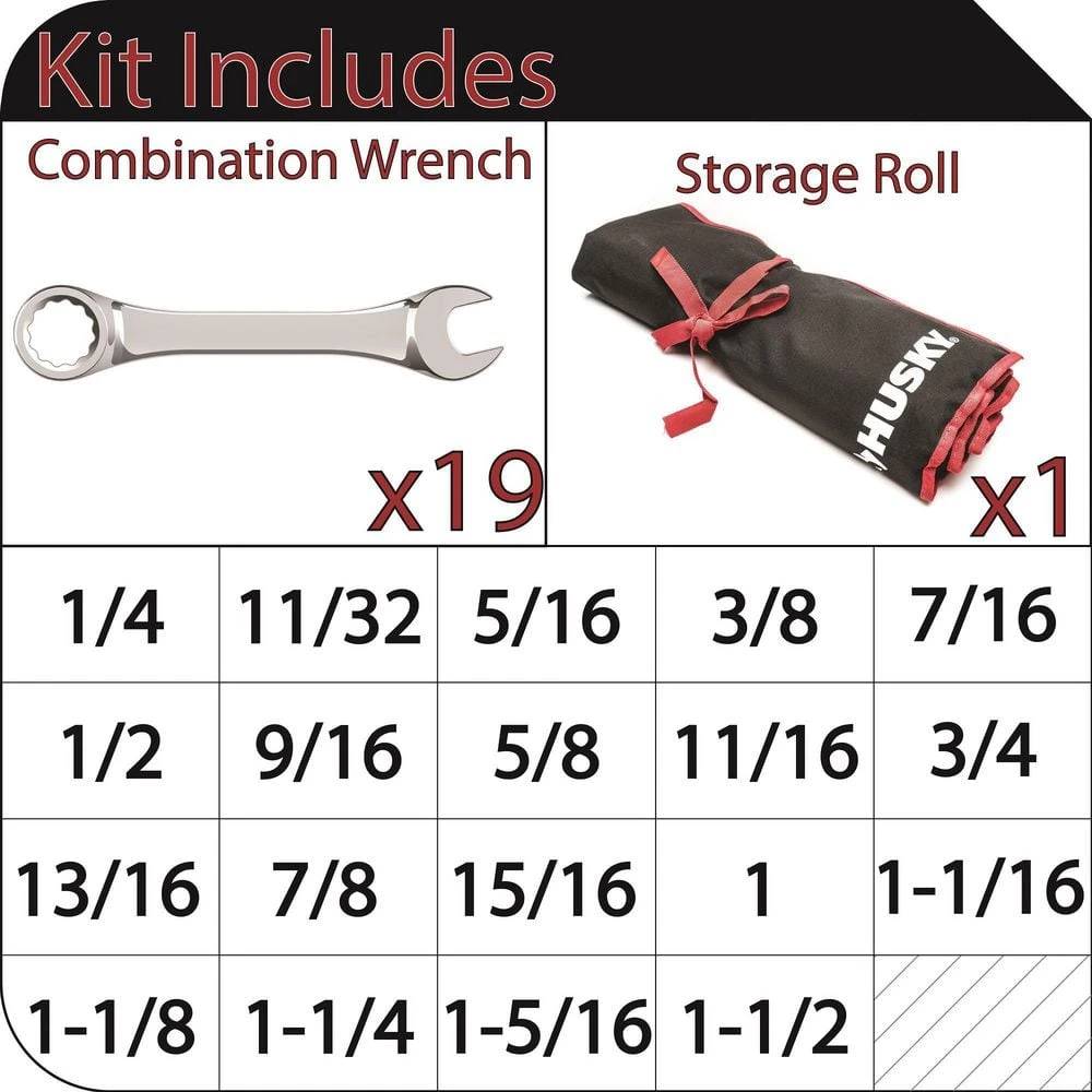 - Master SAE combo wrench set, 19-piece: 1/4, 11/32, 5/16, 3/8, 7/16, 1/2, 9/16, 5/8, 11/16, 3/4, 13/16, 7/8, 15/16, 1, 1-1/16, 1-1/8, 1-1/4, 1-5/16, 1-1/2 in.