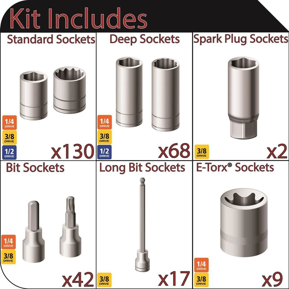 - Set includes: (25) 1/4 in. drive 6-point sockets, (20) 1/4 in. drive 12-point sockets, (22) 1/4 in. drive 6-point deep sockets, (28) 3/8 in. drive 6-point sockets, (23) 3/8 in. drive 12-point sockets, (22) 3/8 in. drive 6-point deep sockets, (2) 3/8 in. drive spark plug sockets, (34) 1/2 in. drive 12-point sockets, (24) 1/2 in. drive 12-point deep sockets, (9) 1/4, 3/8, and 1/2 in. E-Torx sockets, (31) 1/4 in. Bit Sockets, and (28) 3/8 in. Bit Sockets