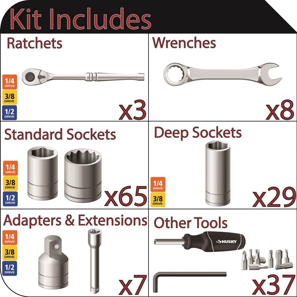 The Husky 149-piece 1/4 in., 3/8 in., and 1/2 in. drive mechanics tool set a has an extensive assortment of mechanics tools and is an ideal choice for your workshop or garage. The 94 different standard and deep sockets along with eight combination wrenches will allow you to tackle a just about any fastening or repair project. This Husky 149-piece tool set has just about everything for the DIYer or professional mechanic to get the job done.