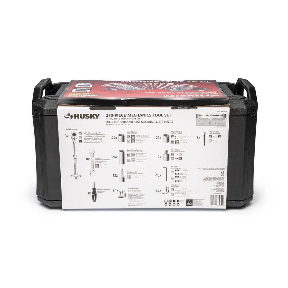 The Husky 270-piece 1/4 in, 3/8 in. and 1/2 in. drive Mechanics Tool Set offers a comprehensive selection of tools for the professional or DIY-mechanic’s workshop. Packed into a handy storage case with tool trays marked by drive size, the 89 different standard and deep sockets, along with the 8-combination wrenches and 28-bit sockets, will allow you to tackle any fastening or repair project. This Husky 270-piece tool set will provide the novice or professional with a huge assortment of durable and reliable tools to get the job done. 3-ratchets, 65-standard sockets, 24-deep sockets, 3-extensions, 8-combination wrenches, and 167-other tools including bit sockets, hex keys, etc. make up this mechanics tool set. for a complete listing of tools included, see the specification document in the info and guides section.