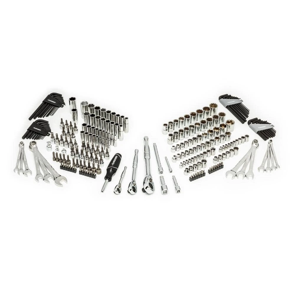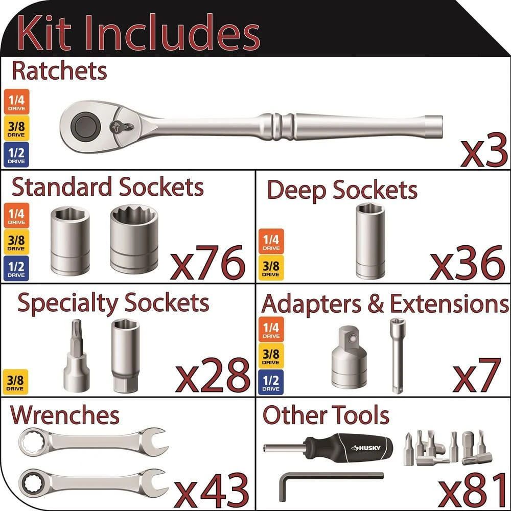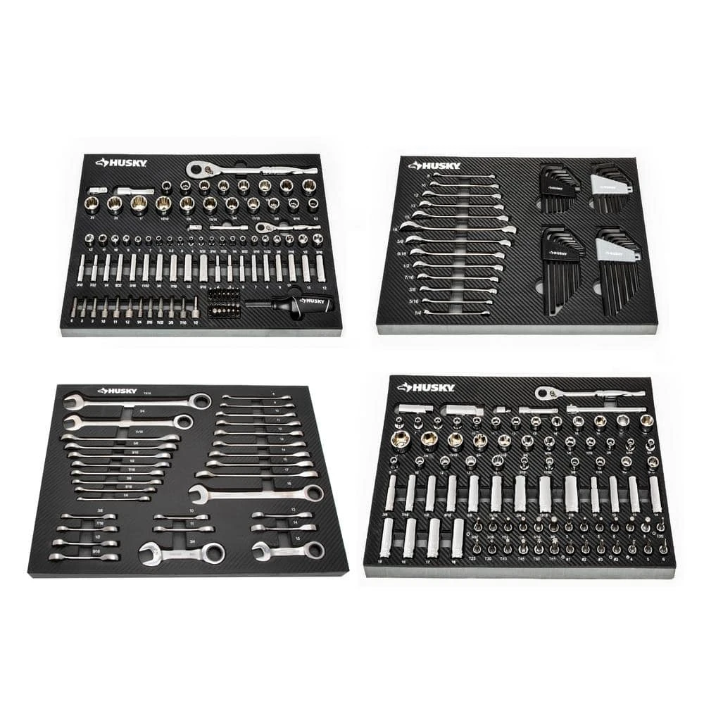 The Husky 274-piece 1/4 in., 3/8 in. and 1/2 in. drive mechanics tool set offers a comprehensive selection of tools for the professional or DIY mechanics workshop. The wide variety of standard and deep sockets along with an assortment of combination wrenches, ratcheting wrenches and bit sockets will allow you to tackle any fastening or repair project. Husky ratcheting wrenches feature a 12-point design to help prevent fastener damage and increase torque. A durable, polished chrome finish provides corrosion resistance for a lifetime of use while an alloy steel construction provides long-lasting performance. Wrenches have box-end design for additional leverage and to prevent slipping on hard-to-remove fasteners. Ratcheting box end needs only a 5° arc to turn a fastener, making hard-to-reach areas more accessible. This tool set will provide the novice or professional with a huge assortment of durable and reliable tools to get the job done. Comes packed in portable EVA foam storage trays to keep your tools organized inside your toolbox.