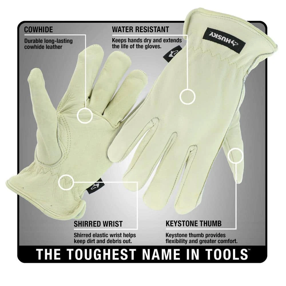 Tackle the tough jobs with the Water-Resistant Leather Work Glove from Husky. Perfect for heavy-duty work in both wet and damp conditions that allow your hands to remain dry. Features 100% grain cowhide construction which offers long-lasting durability, incredible protection and years of use.