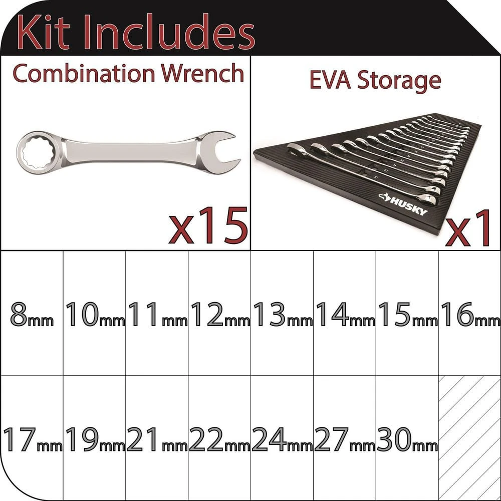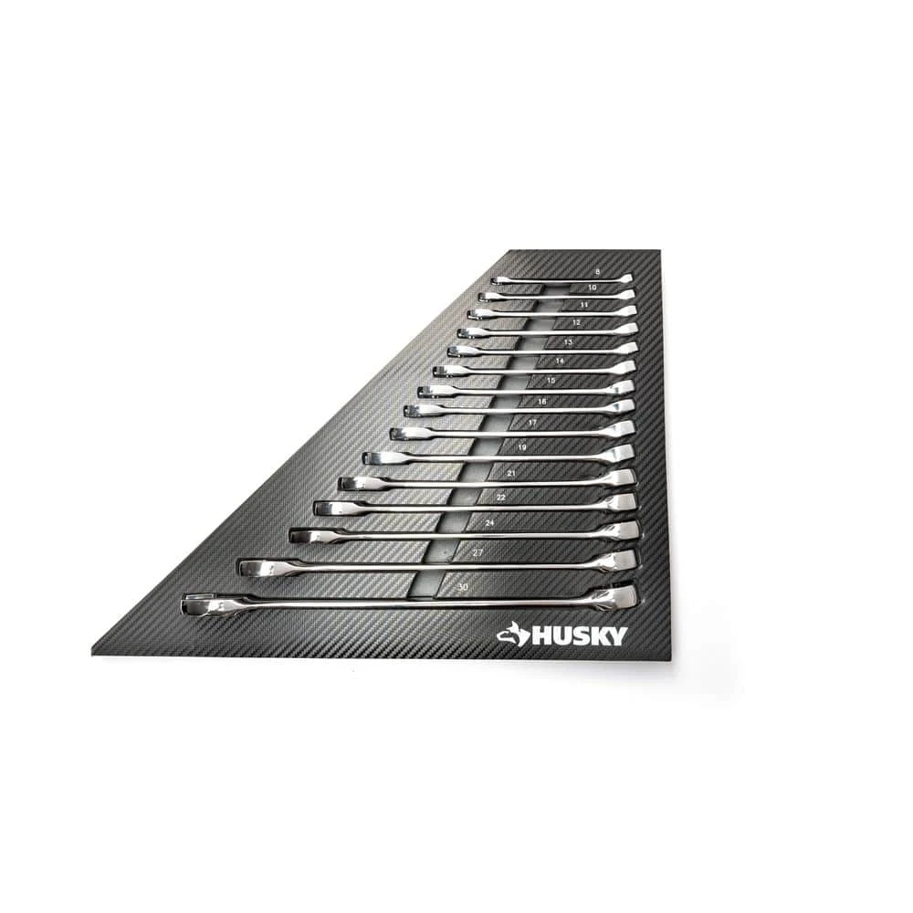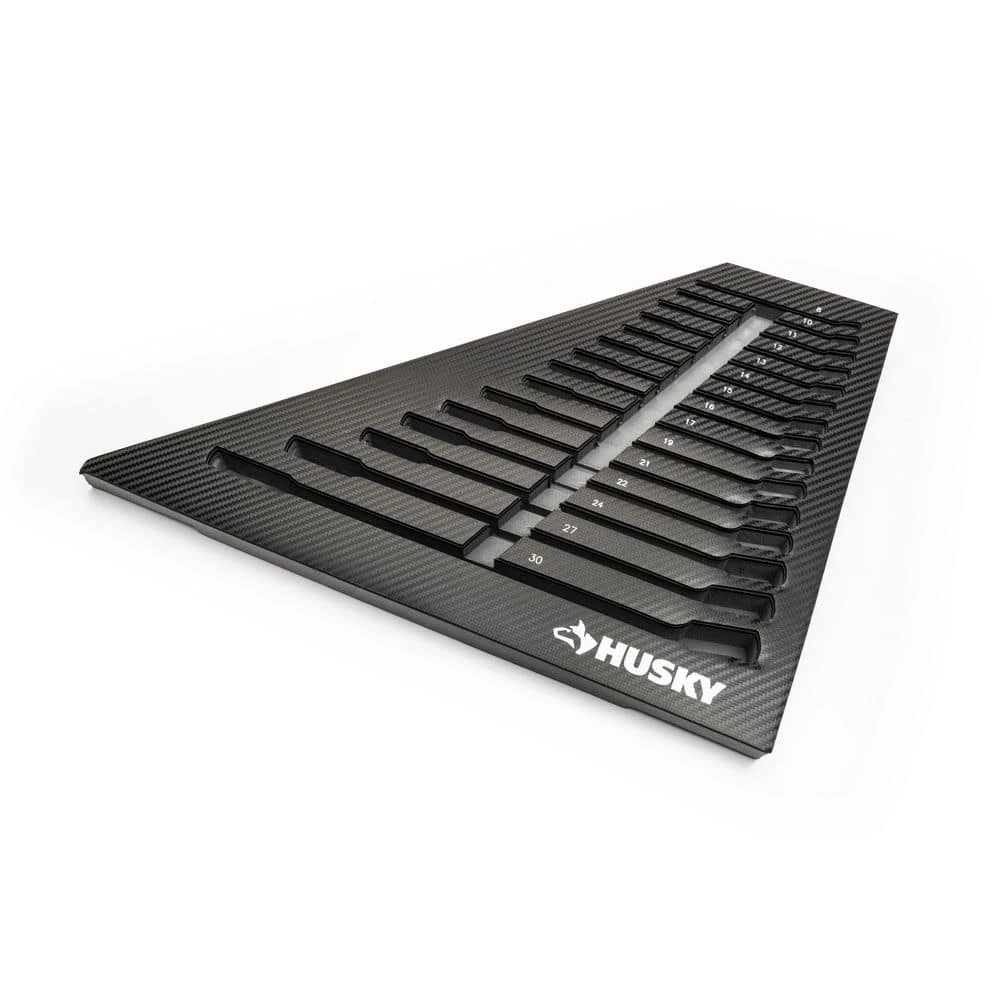 This Husky EVA foam storage tray comes ready to go with 15 combination wrenches and is a great solution for garage organization needs. Sizes are clearly marked for quick identification so nothing will slow you down. Fit this tray inside your toolbox drawer or anywhere in your shop for structured storage wherever you need it. Set includes 8mm, 10mm – 17mm, 19mm, 21mm, 22mm, 24mm, 27mm, and 30mm sizes.