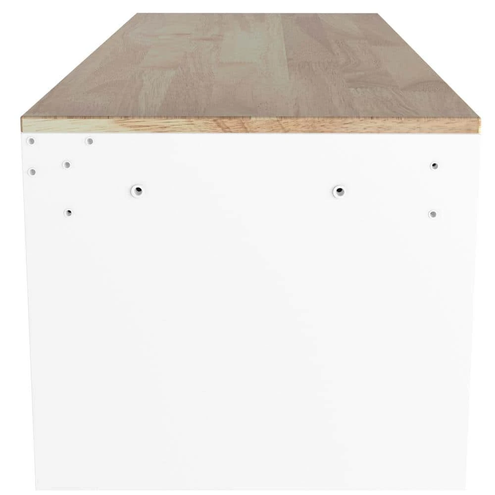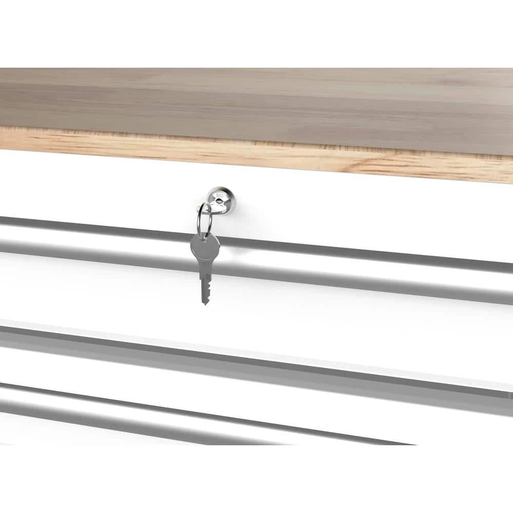 The Husky Modular 52 in. W 10-Drawer White Mobile Workbench is part of a system that allows you to customize your own steel storage configuration. The modular system consists of the mobile workbench, top chest, pegboard and side locker (all components sold separately). The mobile workbench is constructed of an all-welded 21-Gauge steel frame and a 3/4 in. solid wood top. 10 drawers of varying sizes enable 1 to find the right place to store and organize all your tools, parts and supplies. All drawers have a pre-cut liner and are equipped with 100 lbs. rated ball-bearing slides that feature a soft-closing mechanism that ensures your drawers do not slam closed. On the side of the unit is an integrated power strip with 6 outlets and 2 USB ports that will enable you to charge your tools and other electronics. Finally, 1 can easily move the workbench around the workspace on 5 in. x 2 in. casters with the large ergonomic push handle. This Husky 52 in. 10-Drawer White Mobile Workbench will be a great addition to your workspace on its own or combined with the additional modular components.