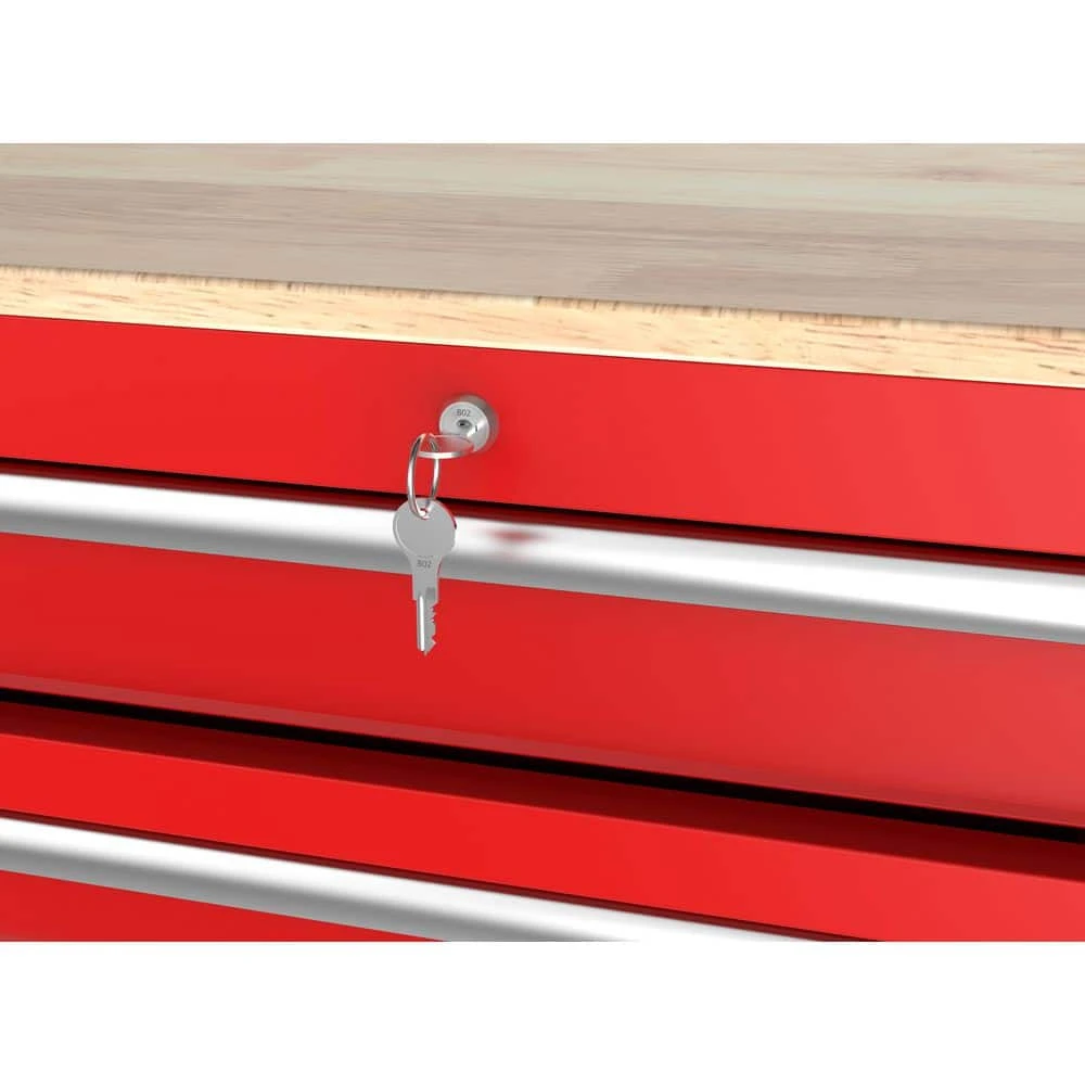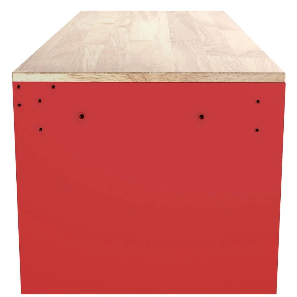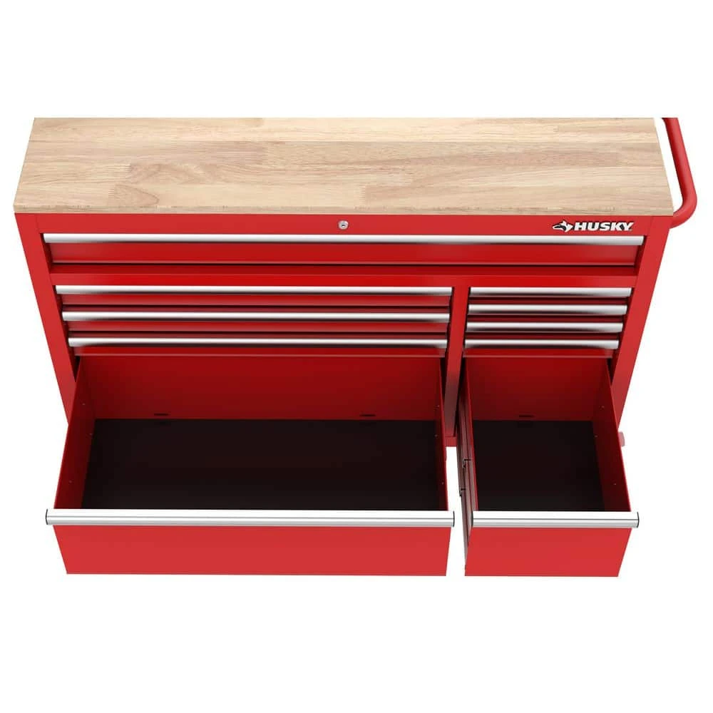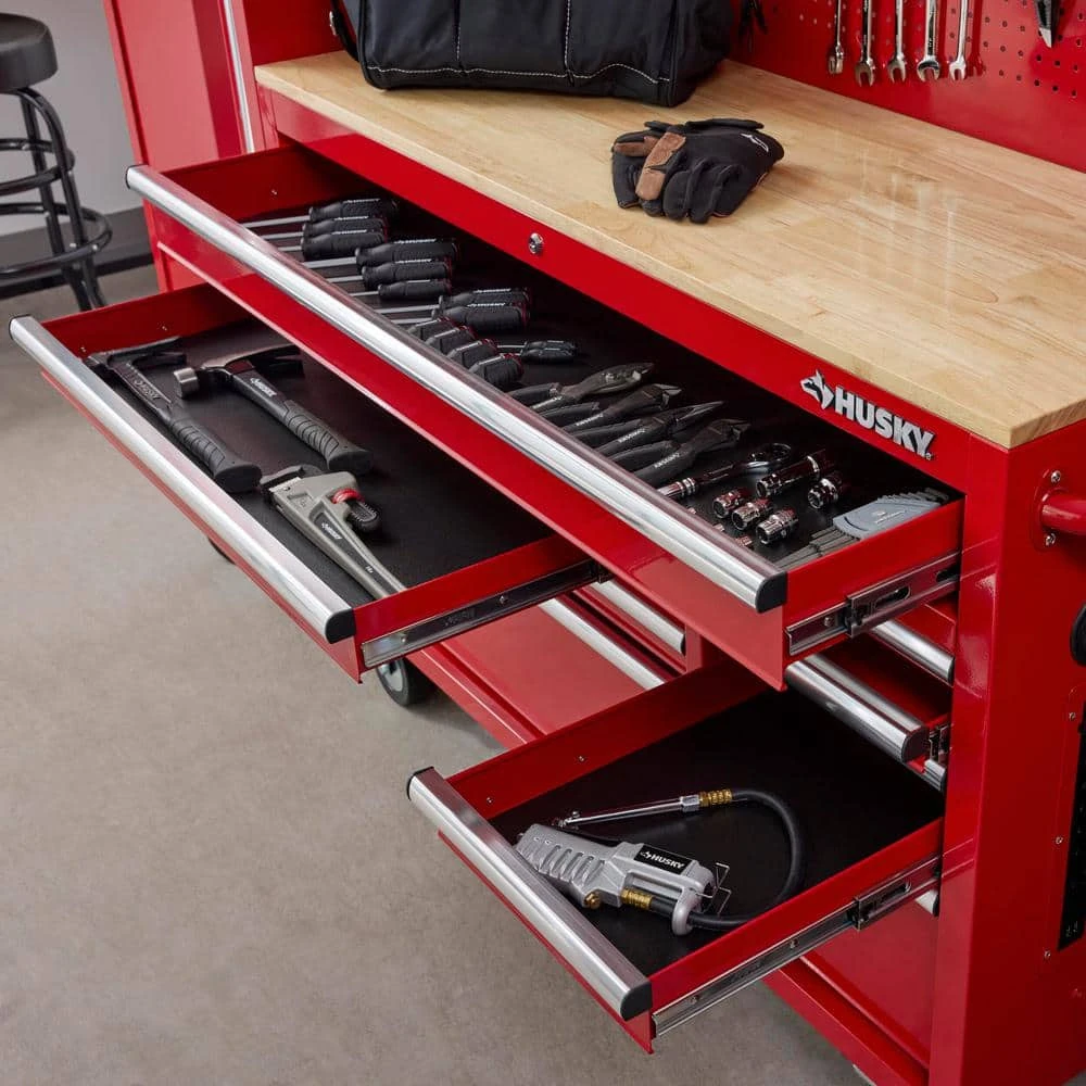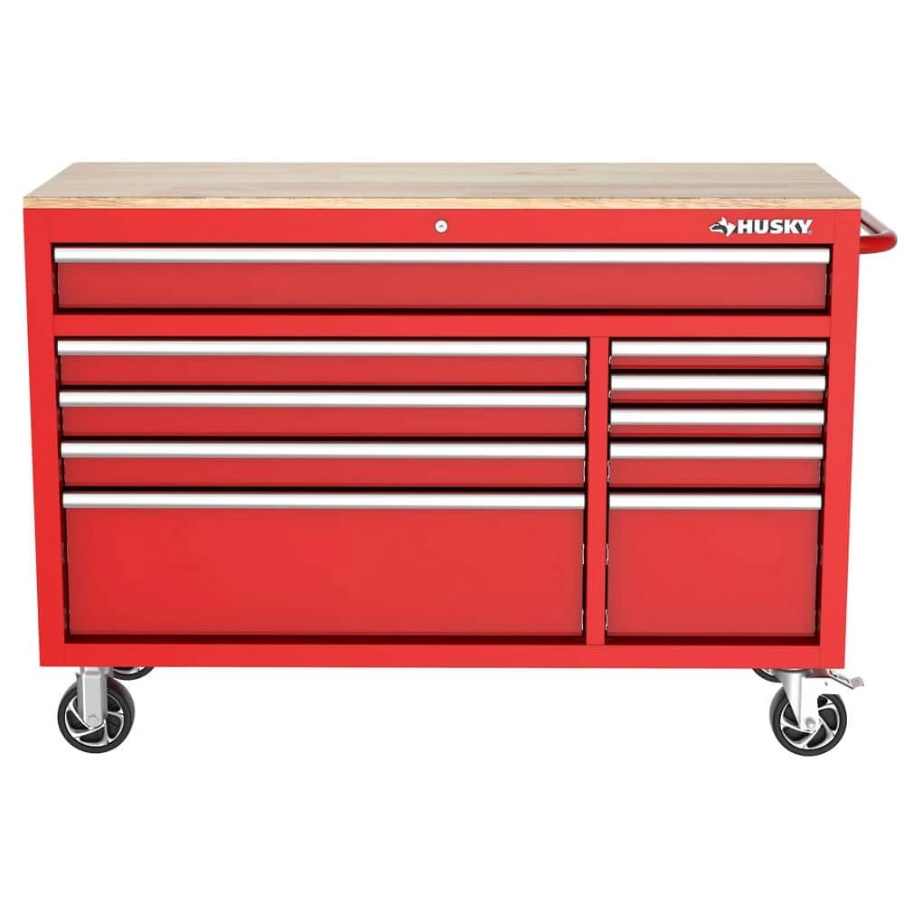 The Husky Modular 52 in. W 10-Drawer Red Mobile Workbench is part of a system that allows you to customize your own steel storage configuration. The modular system consists of the mobile workbench, top chest, pegboard and side locker (all components sold separately). The mobile workbench is constructed of an all-welded 21-Gauge steel frame and a 3/4 in. solid wood top. Ten drawers of varying sizes enable 1 to find the right place to store and organize all your tools, parts and supplies. All drawers have a pre-cut liner and are equipped with 100 lbs. rated ball-bearing slides that feature a soft-closing mechanism that ensures your drawers do not slam closed. On the side of the unit is an integrated power strip with 6 outlets and 2 USB ports that will enable you to charge your tools and other electronics. Finally, 1 can easily move the workbench around the workspace on 5 in. x 2 in. casters with the large ergonomic push handle. This Husky 52 in. 10-Drawer Red Mobile Workbench will be a great addition to your workspace on its own or combined with the additional modular components.