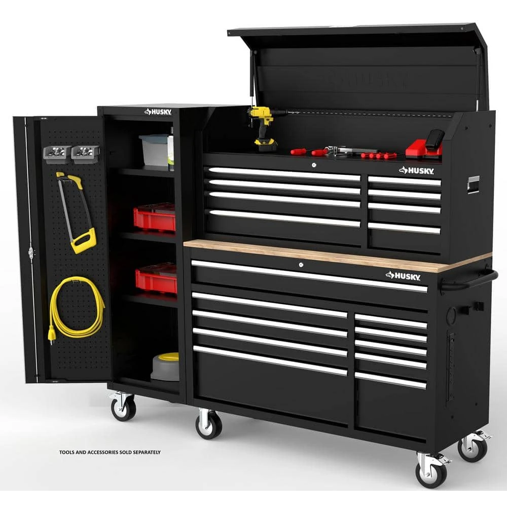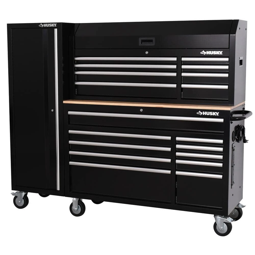Husky Modular 52 in. W 10-Drawer Black Mobile Workbench Cabinet with 52 in. 8-Drawer Top Chest and 20 in. Side Locker is part of a system that allows you to customize your own steel storage configuration. This particular combo consists of the 52 in. 10-Drawer Mobile Workbench, 52 in. 8-Drawer Top Tool Chest and 20 in. Side Locker All components are constructed of an all-welded 21-Gauge steel frame and the workbench has a 3/4 in. solid wood top. All drawers have a pre-cut liner and are equipped with 100 lbs. rated ball-bearing slides that feature a soft-closing mechanism that ensures your drawers do not slam closed. There are integrated power strips with 6 outlets and 2 USB ports in both the top till and side of the workbench that will enable you to charge your tools and other electronics. The side locker can be mounted on either side of your workbench as the door can be flipped to open either way. There are 3 adjustable height shelves that will allow you to configure the storage to best fit your needs. The inside of the door has peg hook holes to organize hanging tools and supplies. 2 grommets will allow you to pass any cords into the locker. Finally, 1-can easily move the entire system around the workspace on 5 in. x 2 in. casters with the large ergonomic push handle. This Husky Modular system will be a great addition to your workspace on its own or combined with the additional modular components.