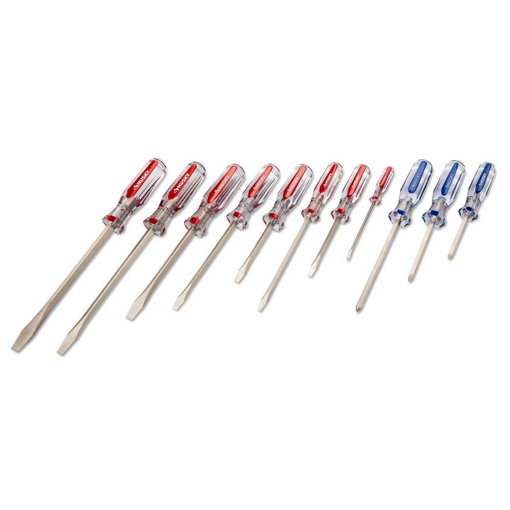 - 11-piece set includes Phillips and slotted screwdrivers, Phillips: 1 x 3 in., 2 x 4 in., and 2 x 6 in. and slotted : 1/8 in. x 4 in., 3/16 in. x 4 in., 3/16 in. x 6 in. 1/4 in. x 4 in. 1/4 in. x 6 in., 5/16 in. x 6 in., 5/16 in. x 8 in. and 3/8 in. x 8 in.