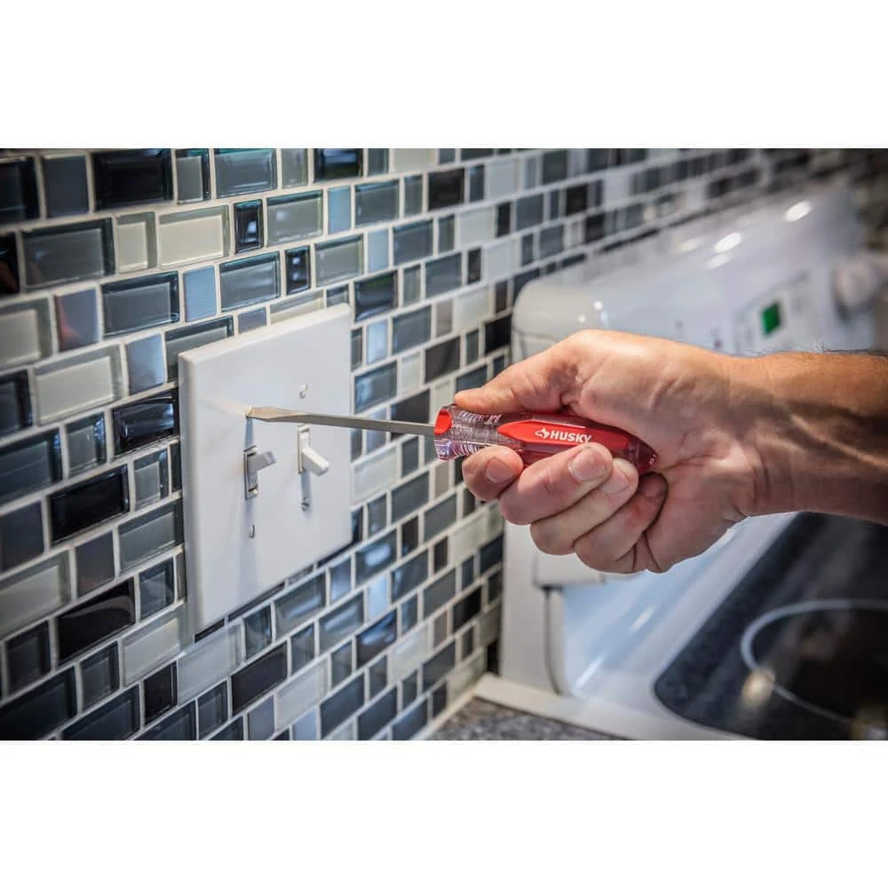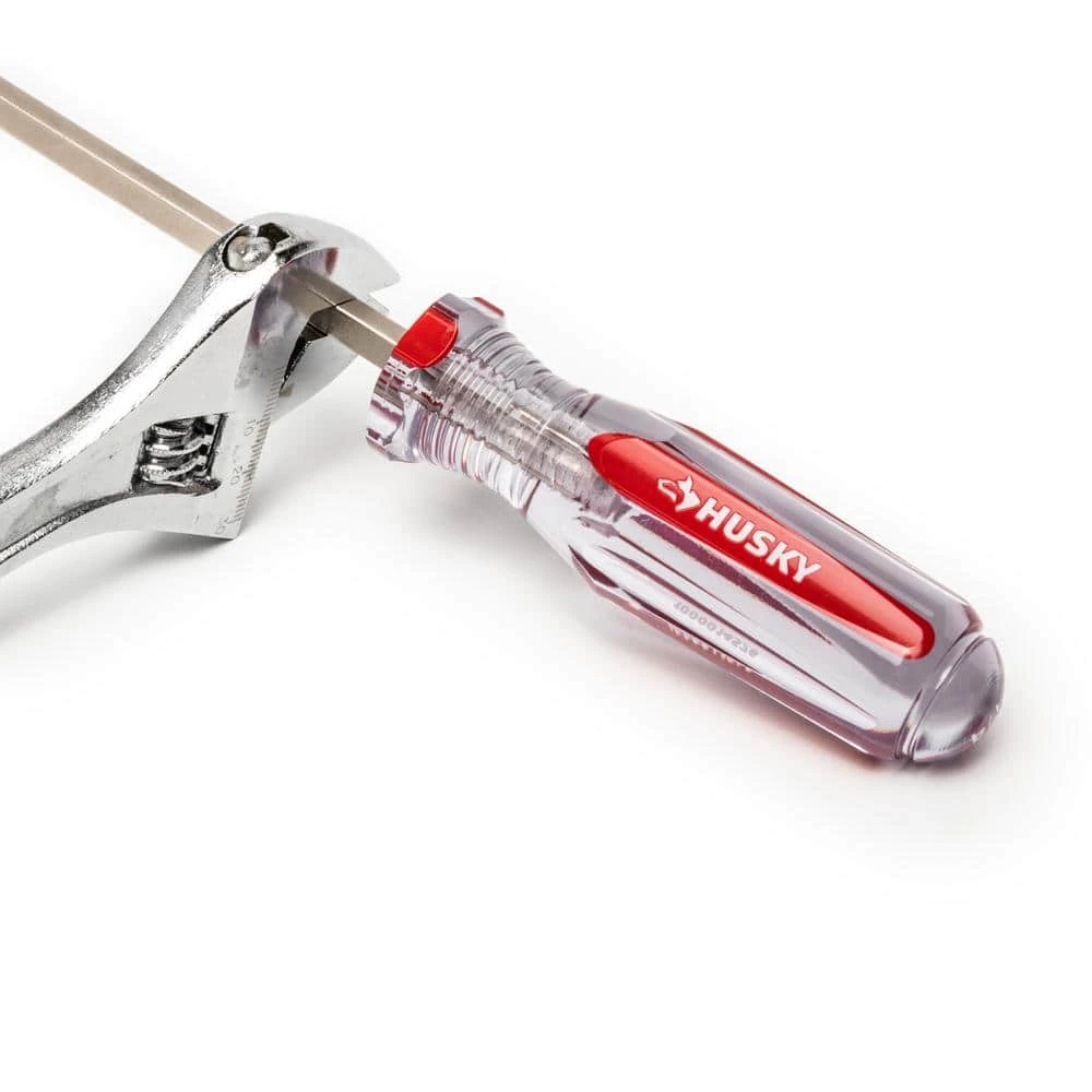 The Husky Philips, Slotted, and Torx Screwdriver Set features an impact- and chemical-resistant acetate handle. The forged steel blade is chrome plated for added corrosion resistance and square to grip with a wrench. The slotted tips are serrated, which provides increased grip and reduces slipping to better avoid fastener rounding. The Phillips tips are precision formed to fit the fastener each and every time.