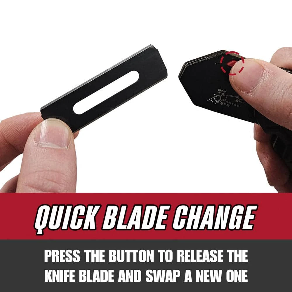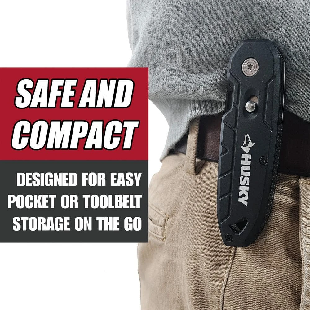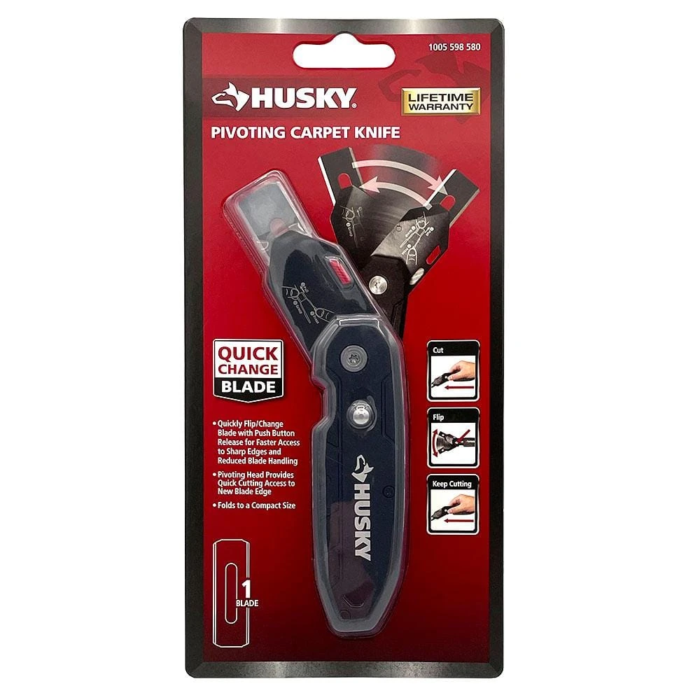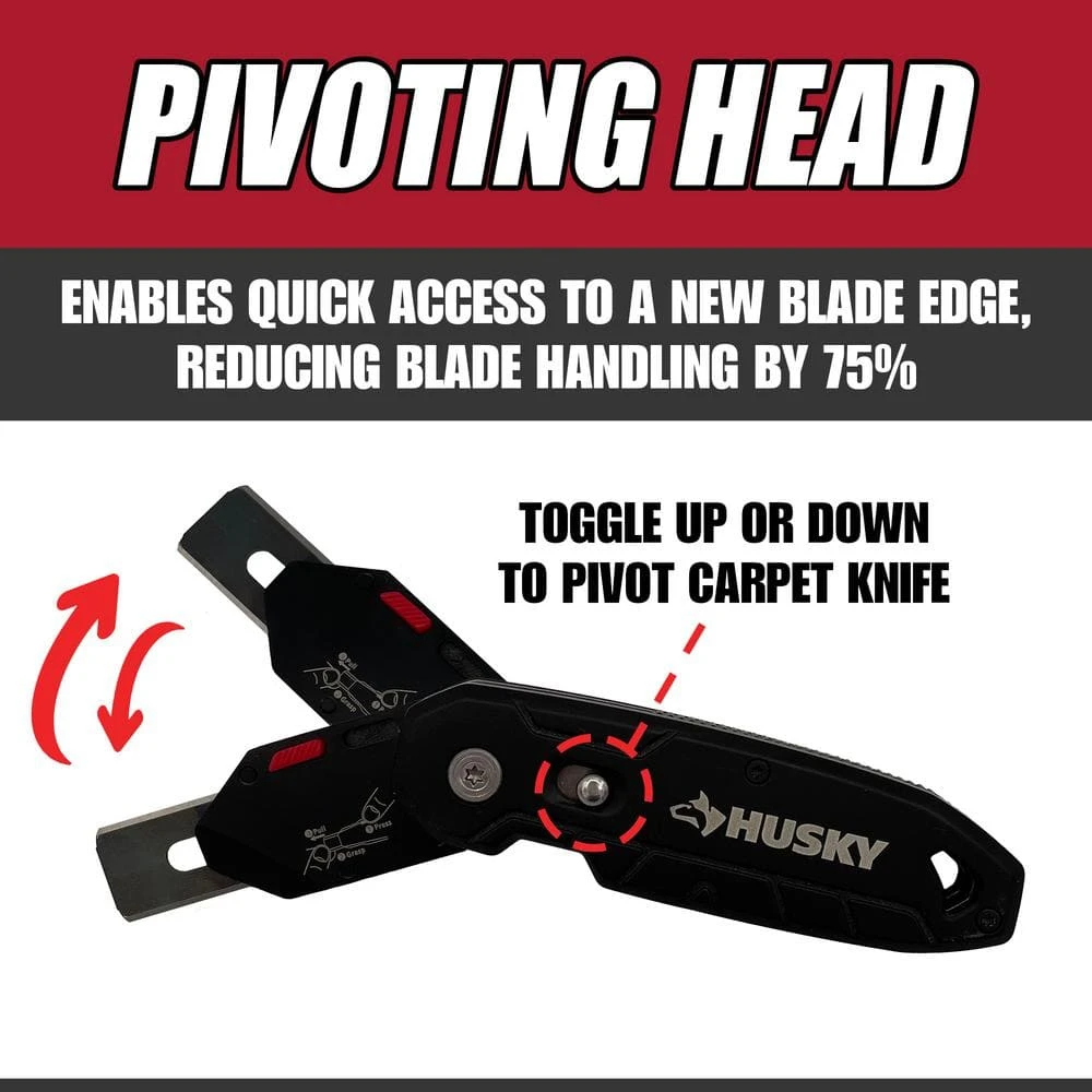 The Husky Pivoting Carpet knife conveniently folds to a compact size when not in use. The heavy-duty handle also includes a handy belt clip, so you can carry anywhere when needed. The carpet knife offers a pivoting head when opened from the folded closed position. The pivoting knife head provides instant access to the opposite honed edge on standard carpet knife blades. This provides a 75% reduction in blade handling versus standard carpet knives. Blade change is also snap with the push of a summary for quick change outs. This knife is built for speed to keep you working and reduce your down time.