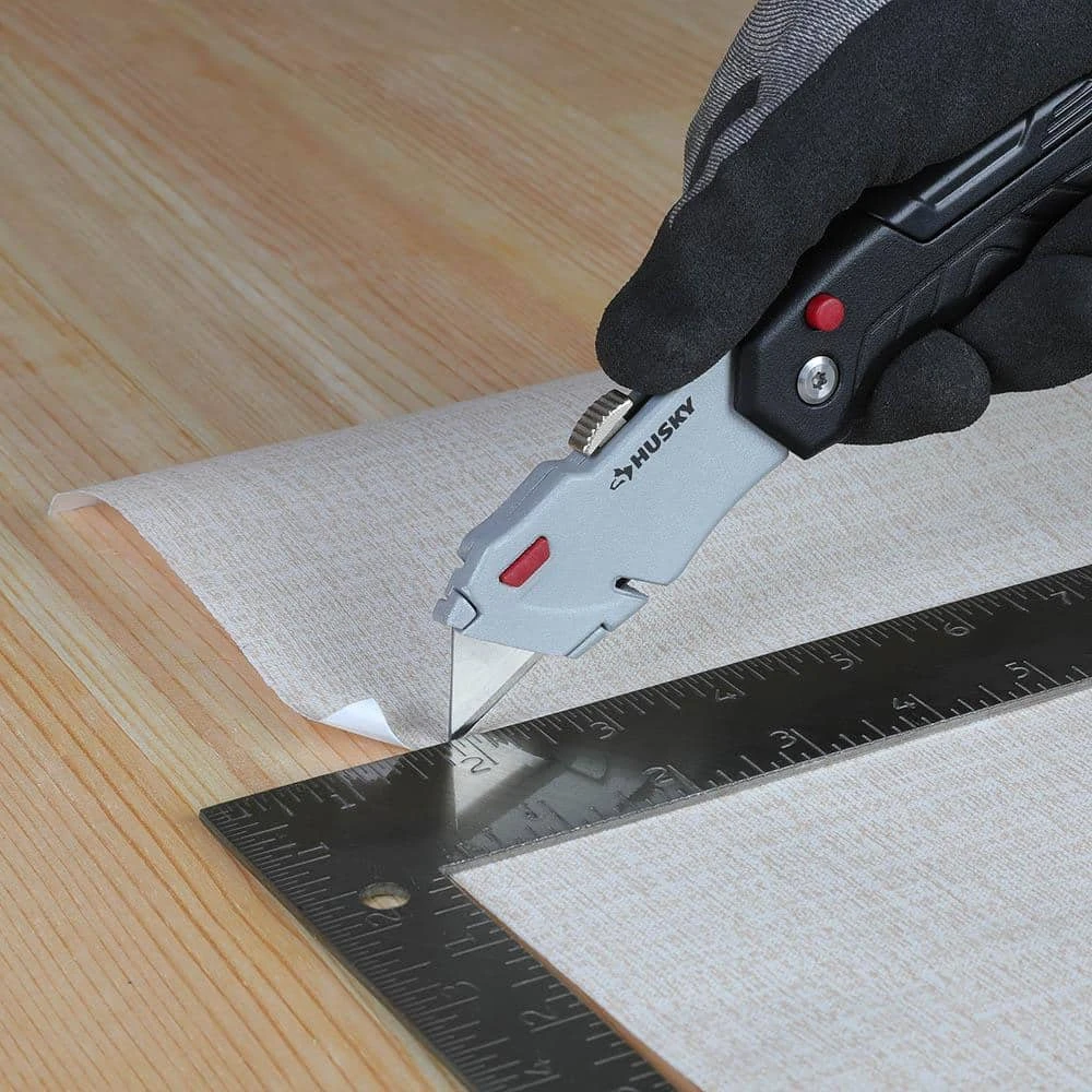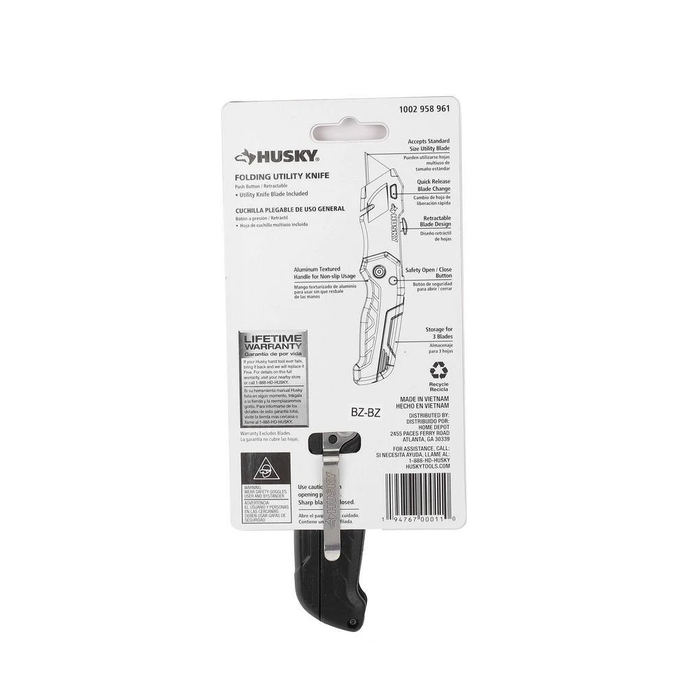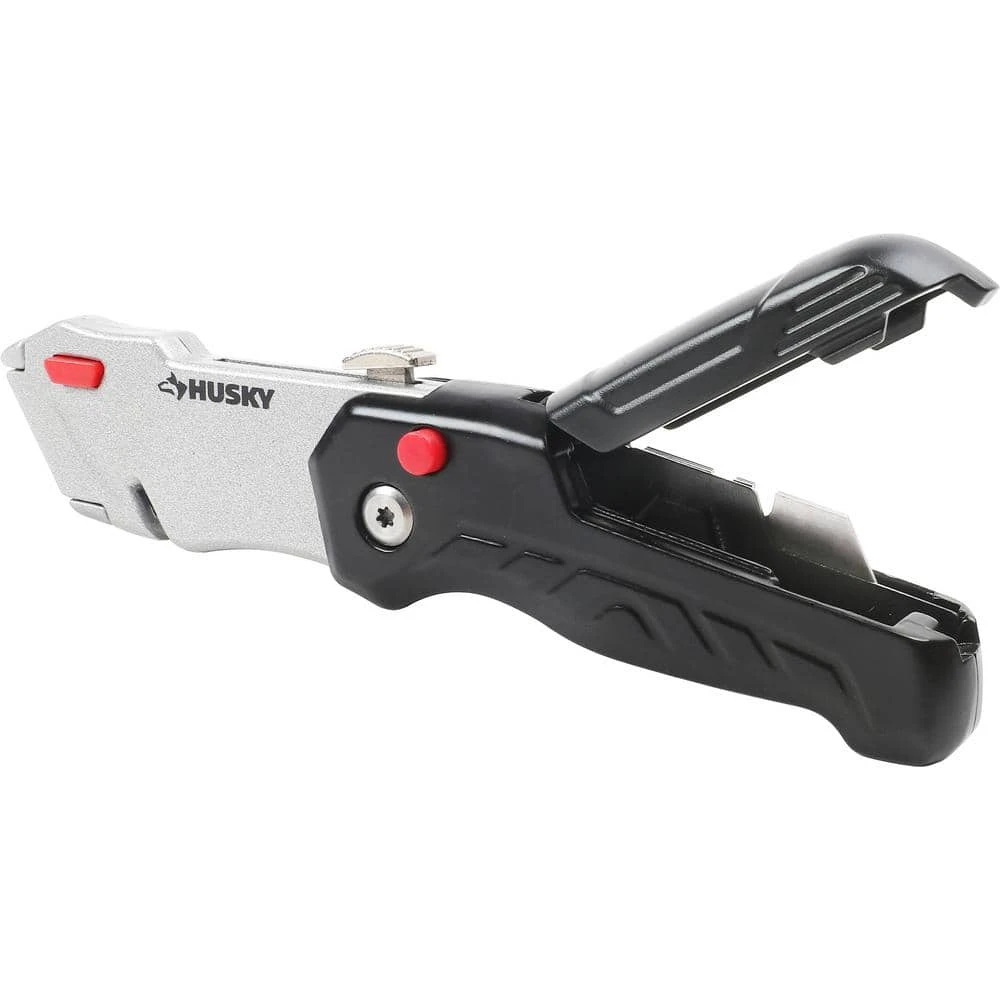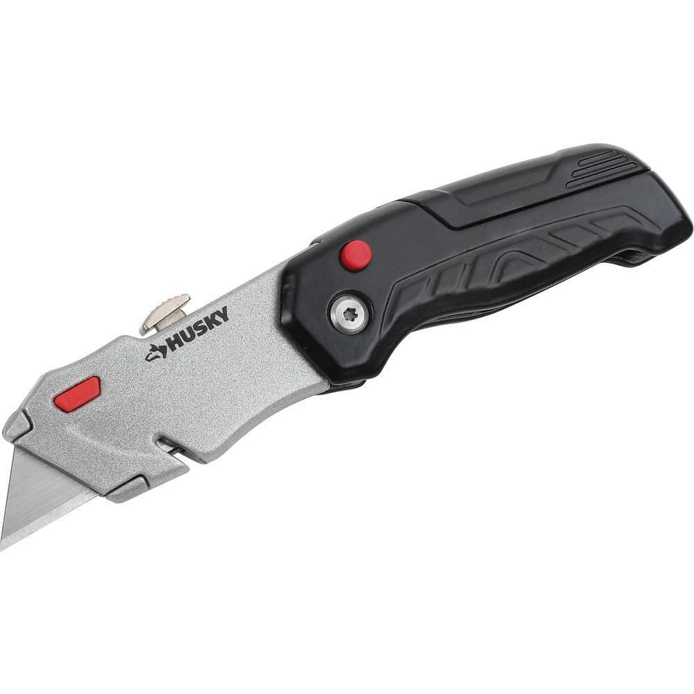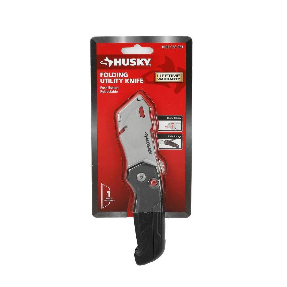 Designed for convenience and safety, this Retractable Folding Utility Knife from Husky has a fast open/close summary and a durable aluminum handle for added strength. Made to handle a variety of materials, the blade measures 2.4-in. for variable cut depth depending on your needs. Each knife accepts standard sized utility blades. Blade storage in handle